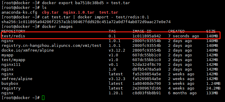 [root@docker ~]# docker export ba7518c38bd5 > nginx.1.0.tar [root@docker ~]# ls anaconda-ks.cfg cby.tar nginx.1.0.tar test.tar
