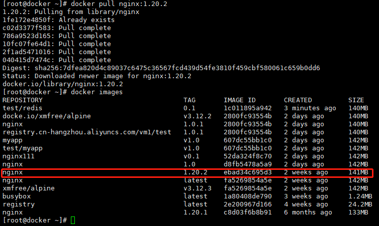 [root@docker ~]# docker pull nginx:1.20.2 1.20.2: Pulling from library/nginx 1fe172e4850f: Already exists c02d3377f583: Pull complete 786a9523d165: Pull complete 10fc07fe64d1: Pull complete 2f1ad5471016: Pull complete 040415d7474c: Pull complete Digest: sha256:7dfea820d4c89037c6475c36567fcd439d54fe3810f459cbf580061c659b0dd6 Status: Downloaded newer image for nginx:1.20.2 docker.io/library/nginx:1.20.2