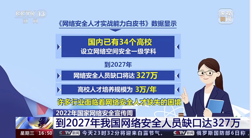 但事实上,网络安全人才供给明显存在巨大缺口,据教育部《网络安全人才实战能力白皮书》数据显示,有高达92%的企业认为自己缺乏网络安全实战人才。预计到2027年,我国网络安全人员缺口将达327万,而高校人才培养规模为3万/年,许多行业面临着网络安全人才缺失的困境。