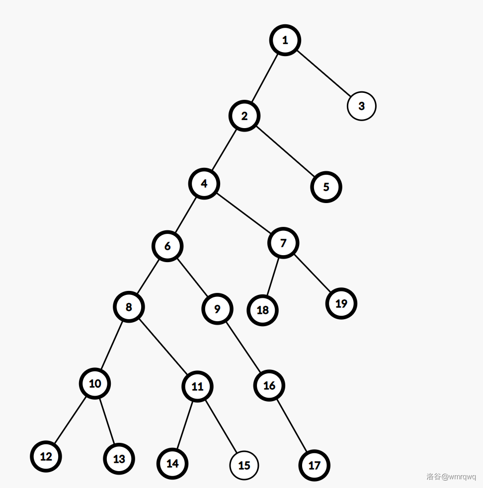 然后为了便于大家理解,我就放张图片吧,加粗的节点为需要询问的节点,这张图片为初始询问节点为叶子结点的情况,容易发现这种情况操作次数是最多的,数一下也能发现询问次数是 \(17\) 次。
