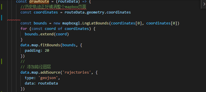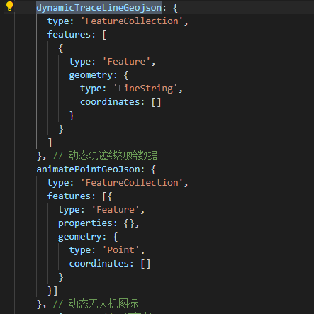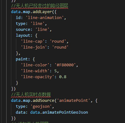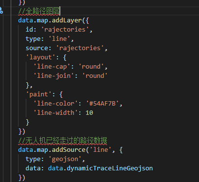 ②:先用空数据加好需要用到的图层:这里我们一共要加3个source和layer:分别是全部轨迹,已经进行完的轨迹,无人机的实时数据