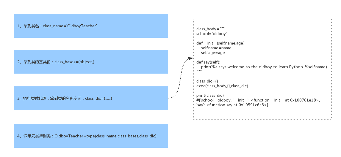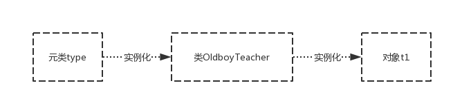 如果一切皆为对象,那么类OldboyTeacher本质也是一个对象,既然所有的对象都是调用类得到的,那么OldboyTeacher必然也是调用了一个类得到的,这个类称为元类