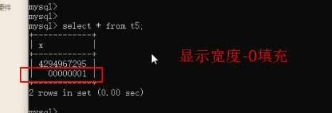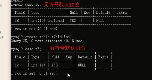 二 基本数据类型之整型:(整型的存储宽度) 1、作用:id号,各种号码,年龄,等级 2、分类: tinyint(**) int (*****) bigint(***) 3、测试:默认整型都是有符号的 create table t1(x tinyint); insert into t1 values(128),(-129); create table t2(x tinyint unsigned); insert into t2 values(-1),(256); create table t3(x int unsigned);#unsigied无符号 #4294967295 insert into t3 values(4294967296); create table t4(x int(12) unsigned); insert into t4 values(4294967296123); 4、强调:对于整型来说,数据类型后的宽度并不是存储限制,而是显示限制 所以在创建表示,如果字段采用的是整型类型,完全无需指定显示宽度, 默认的显示宽度,足够显示完整当初存放的数据 # 显示时,不够8位用0填充,如果超出8位则正常显示 create table t5(x int(8) unsigned zerofill); insert into t5 values(4294967296123); insert into t5 values(1);