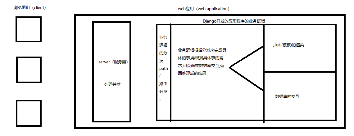 页面模板的渲染和数据库的交互不进行交互,Django开发的业务逻辑与(页面模板的渲染,数据库的交互)进行交互。路径决定调用哪个接口