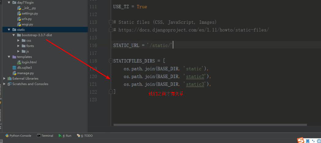 STATIC_URL = '/static/'#被login.html下的static对应 这个是静态文件的路径 STATICFILES_DIRS=[ os.path.join(BASE_DIR,'static'), ]