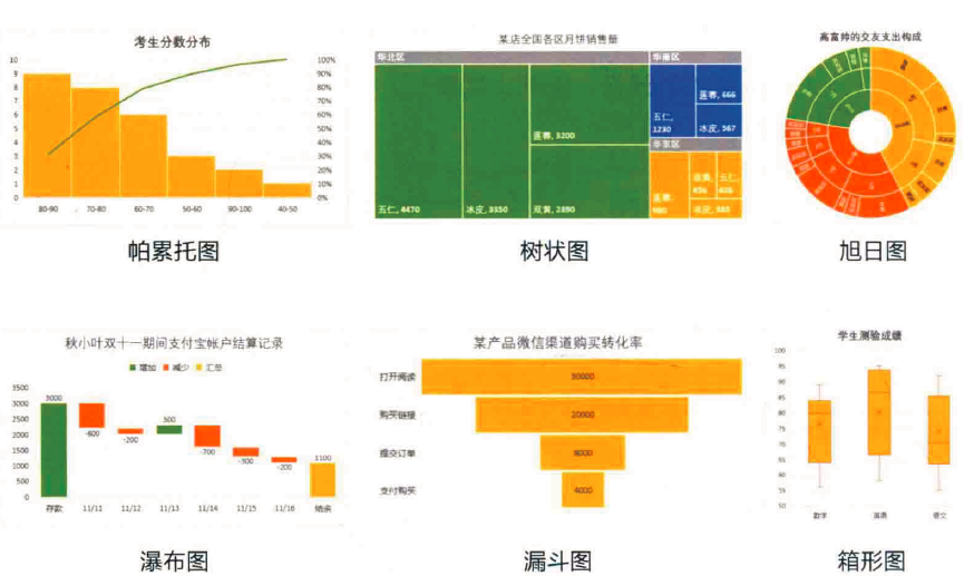 Excel2016新增了着色地图、漏斗图、直方图、瀑布图、旭日图,还有炫酷的三维地图