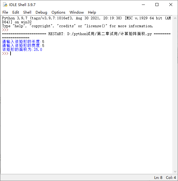 long = float(input("请输入该矩形的长度:" )width= float(input("请输入该矩形的宽度:" ))area = long*widthprint("该矩形的面积为:" +str(area))