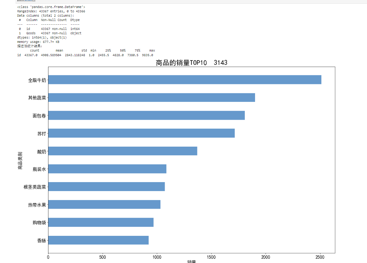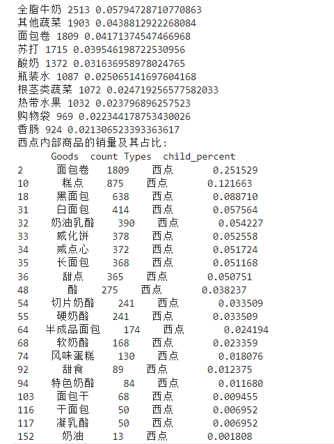for index, row in Top10[:10].iterrows(): print(row['Goods'],row['id'],row['id']/data_nums)