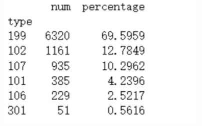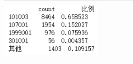 j = i.loc[(i['fullURL'].str.contains('\.html'))==False, ['fullURL','fullURLId','pageTitle']] return j# 注意获取一次sql对象就需要重新访问一下数据库engine = create_engine('mysql+pymysql://root:Qq123456@localhost/test?charset=utf8')sql = pd.read_sql('all_gzdata', engine, chunksize = 10000)# 分块读取数据库信息counts5 = [xiaguang(i) for i in sql]counts5 = pd.concat(counts5)xg1 = counts5['fullURLId'].value_counts()print(xg1)# 求各个部分的占比xg_ = pd.DataFrame(xg1)xg_.reset_index(inplace=True)xg_.columns= ['index', 'num']xg_['perc'] = xg_['num']/xg_['num'].sum()*100xg_.sort_values(by='num',ascending=False,inplace=True)xg_['type'] = xg_['index'].str.extract('(\d{3})') #提取前三个数字作为类别id xgs_ = xg_[['type', 'num']].groupby('type').sum() #按类别合并xgs_.sort_values(by='num', ascending=False,inplace=True) #降序排列xgs_['percentage'] = xgs_['num']/xgs_['num'].sum()*100print(xgs_.round(4))