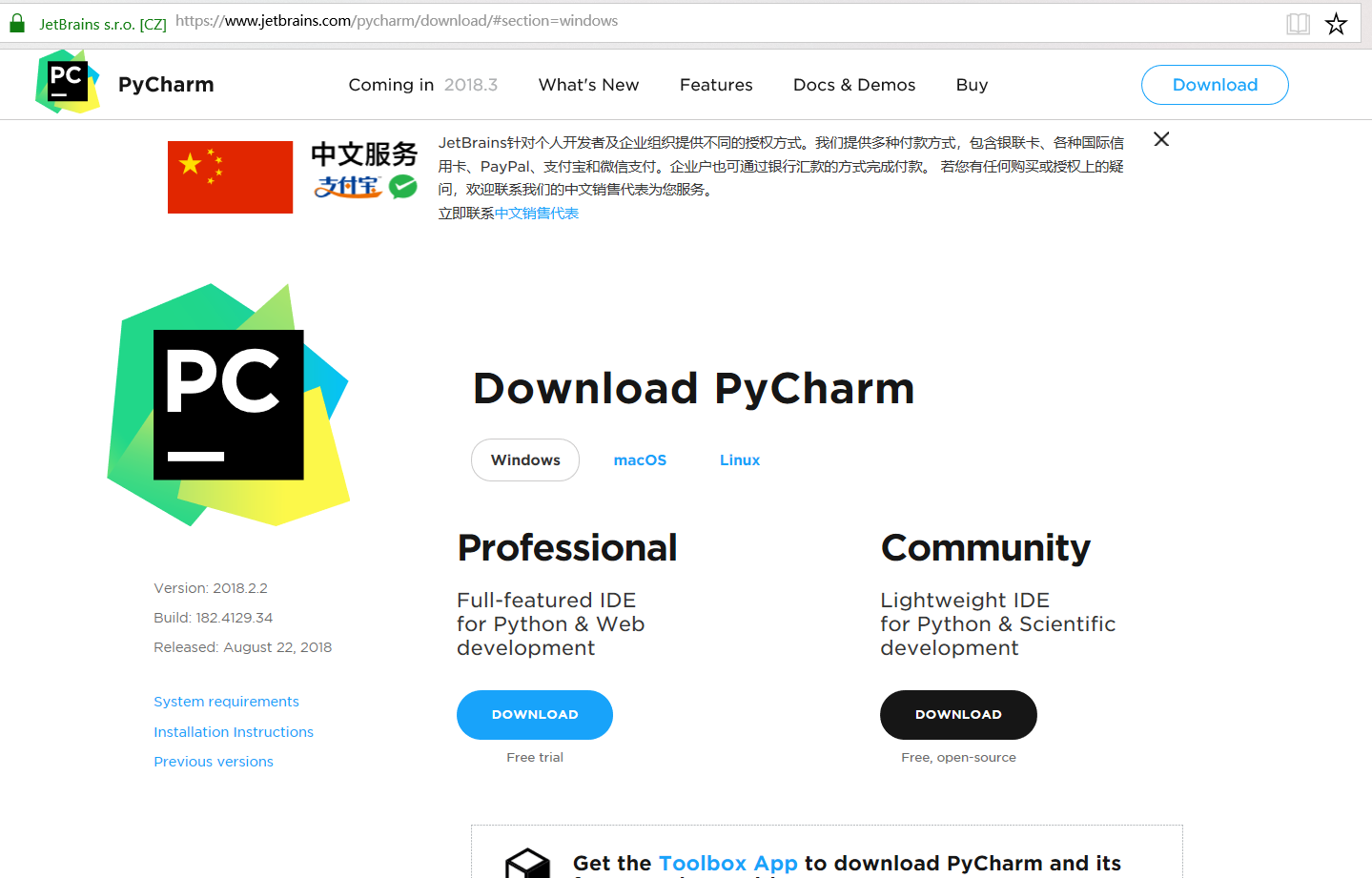 PyCharm 地址:https://www.jetbrains.com/pycharm/download/#section=windows