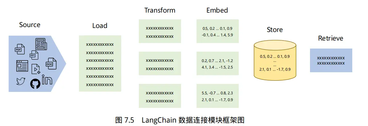 LangChain 数据连接(Data connection)模块支持自定义数据,支持加载、转换、存储和查询数据,模块具体内容包括:Document loaders、Document transformers、Text embedding models、Vector stores 以及 Retrievers。数据连接模块部分的基本框架如下。