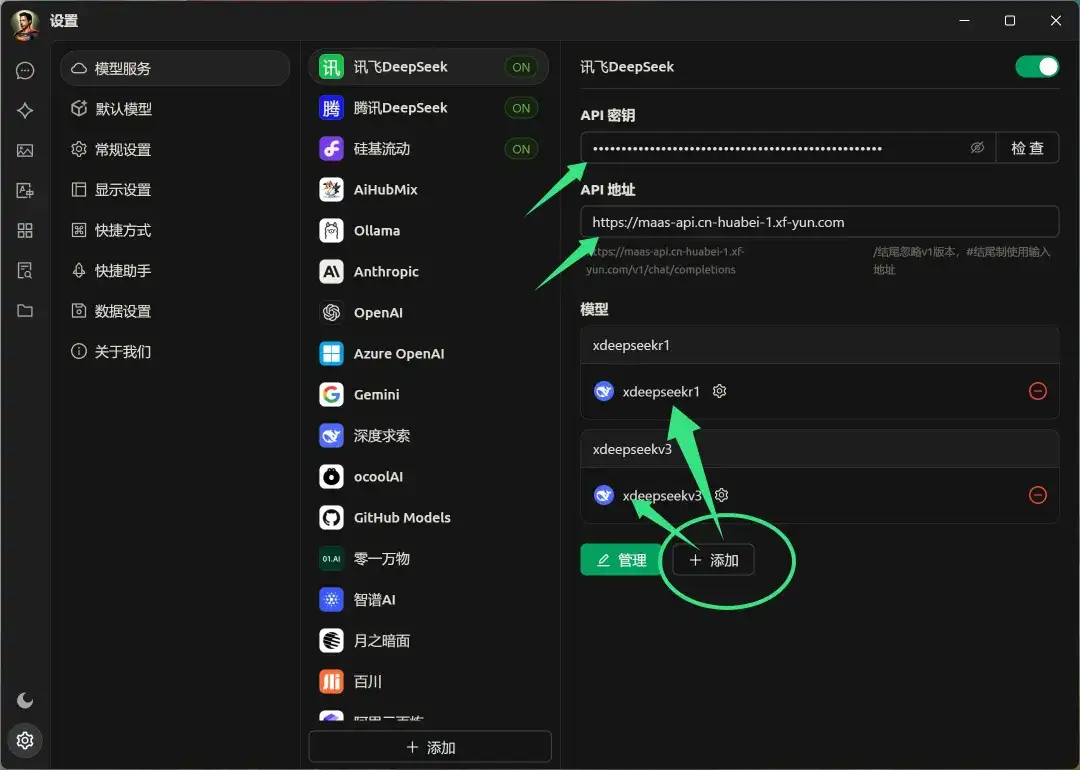 添加的时候,模型名称必须是 xdeepseekr1 或者 xdeepseekv3