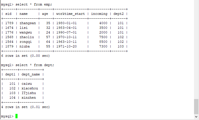 2.1 select sum(incoming) from emp WHERE dept2 = (SELECT dept1 FROM dept where dept_name ='caiwu'); #经典嵌套