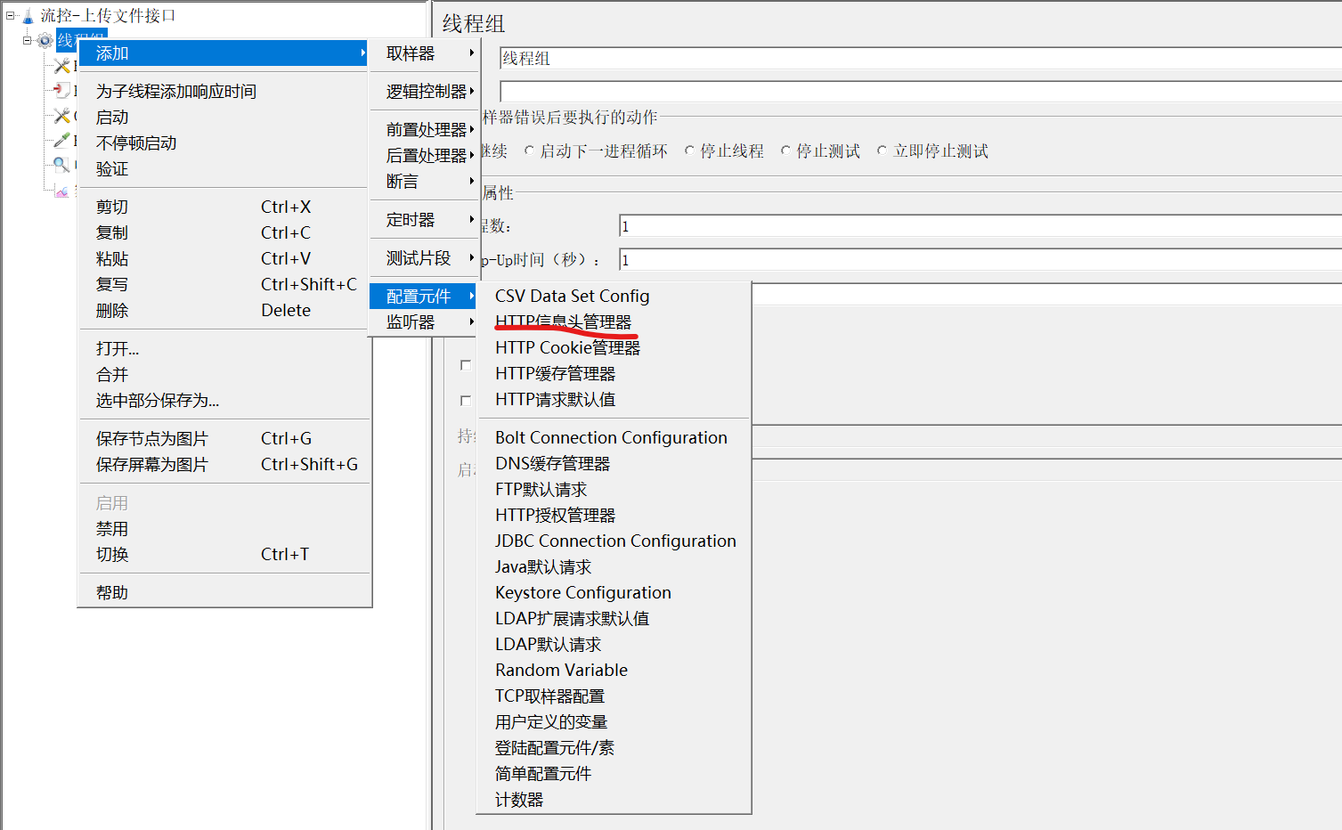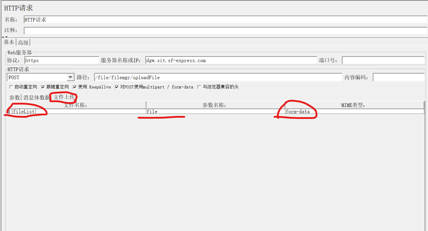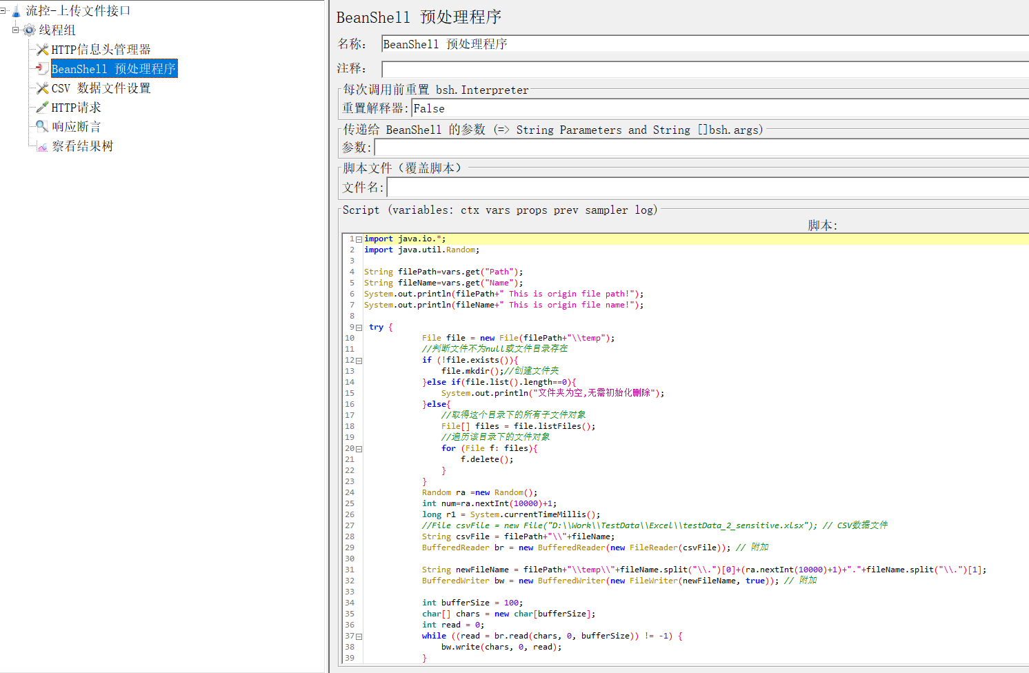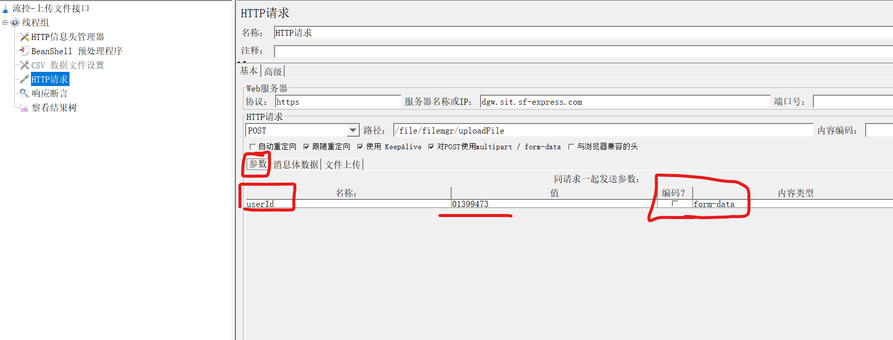 测试计划页并设置用户变量,第一次初始上传的文件名称、文件路径