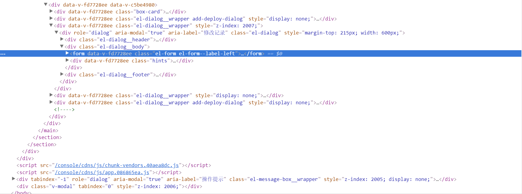 js = "document.getElementsByClassName('el-dialog__wrapper')[0].style.display="block";