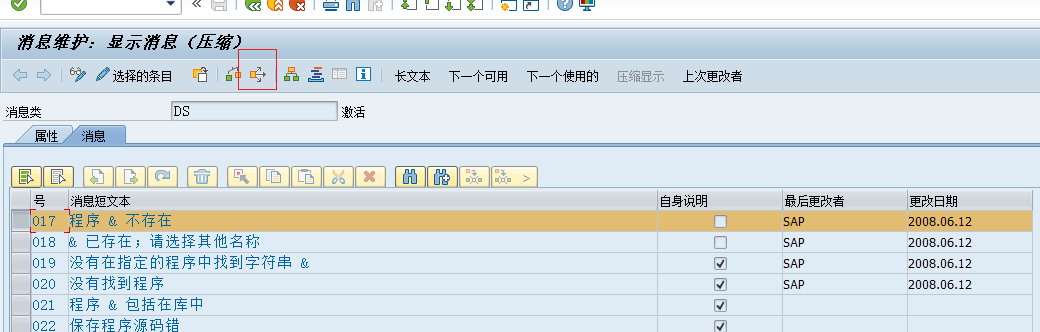 鼠标单击SE38里显示的提示消息,查看这条消息的技术明细:DS017,其中DS代表Message Class的ID,017是这条消息在Message Class里的编号。