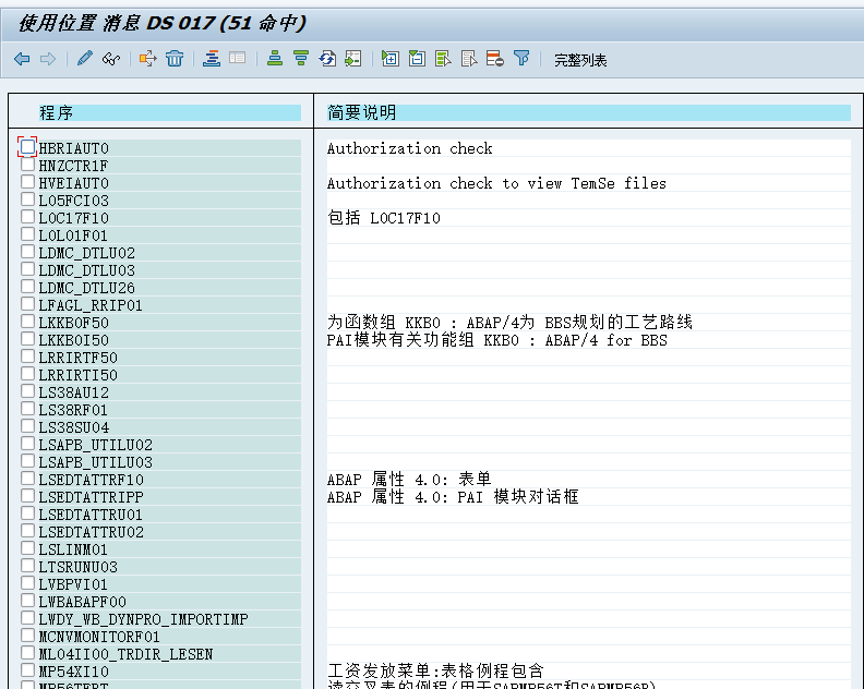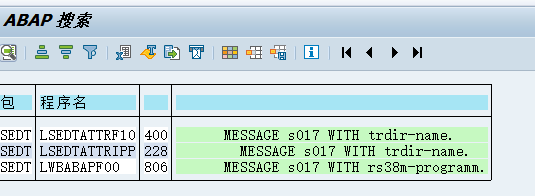 这种情况下只得一条一条看了。注意我们在SE38里看到的消息显示前面有个绿灯,因此说明ABAP代码抛出这条消息时,是以类型S(Successful)投递的。这样我们只看结果列表里MESSAGE s017这种记录,对于MESSAGE E017直接忽略,因为后者抛出的消息前面显示的是红灯。