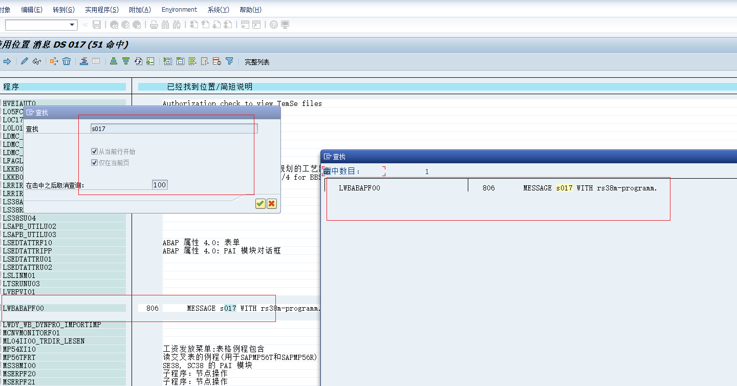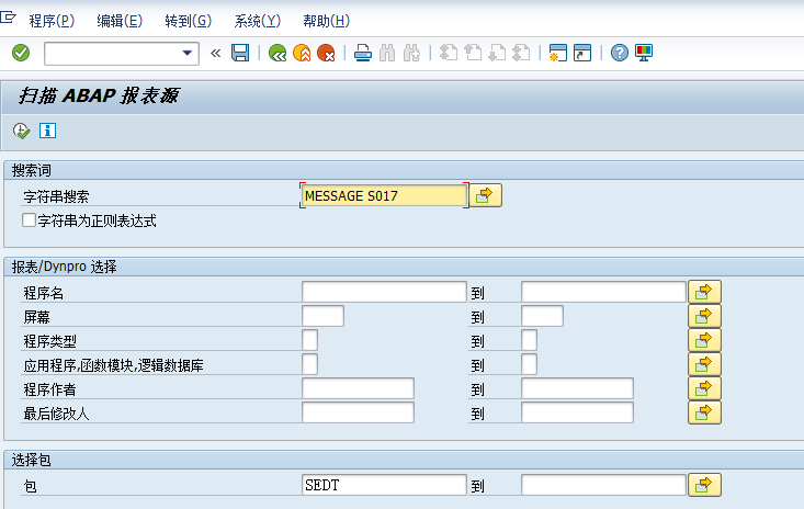 使用源代码扫描工具程序RS_ABAP_SOURCE_SCAN查找SE38实现代码里所有出现了MESSAGE S017的ABAP代码位置: