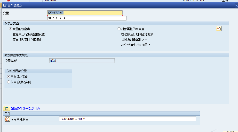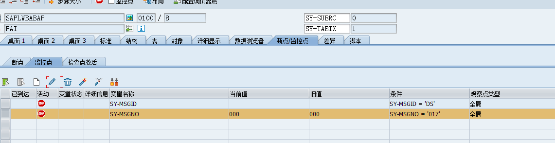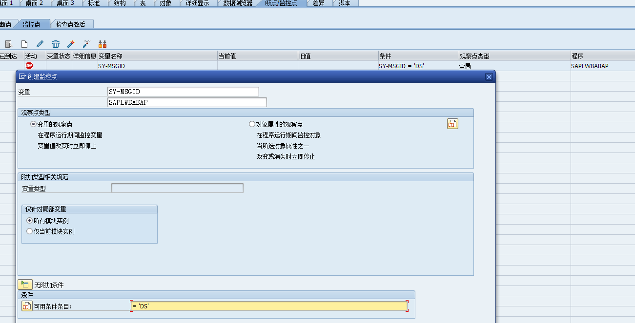 通过ABAP的关键字MESSAGE抛出消息时,系统变量SY-MSGID会自动被填充消息所属的Message Class,在Jerry这个例子里为DS,而SY-MSGNO被填充为抛出消息的编号,这个例子里为017. 因此,通过在调试器里创建watch point并维护相应的触发条件。在程序运行时,一旦触发条件满足,watch point触发,此时执行到的ABAP语句即为消息弹出的准确位置。