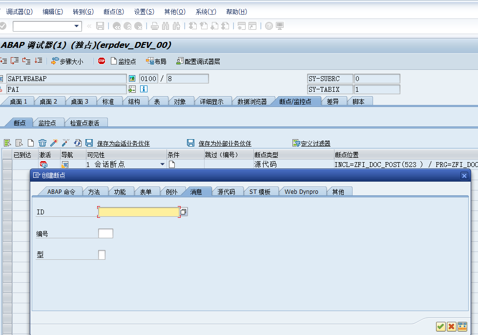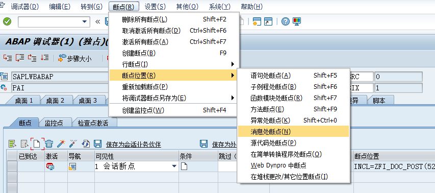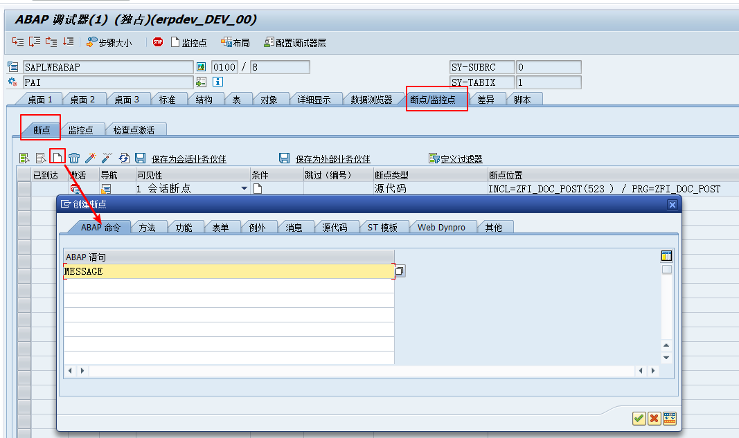 在调试器此处创建类型为ABAP Commands的动态断点,命令设置为MESSAGE. 这样,ABAP调试器会自动在所有出现了MESSAGE关键字的地方停下来。