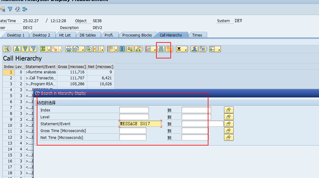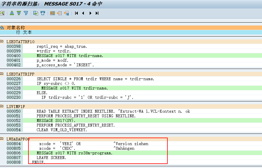 等到100%完成后,来到SAT的结果展示页面里,点击Call Hierarchy标签页,SE38执行的所有ABAP statement罗列如下。使用SAT自带的搜索按钮,输入MESSAGE S017, 执行即可得到结果。双击后就能进入对应的ABAP代码。