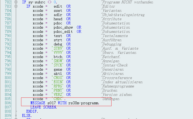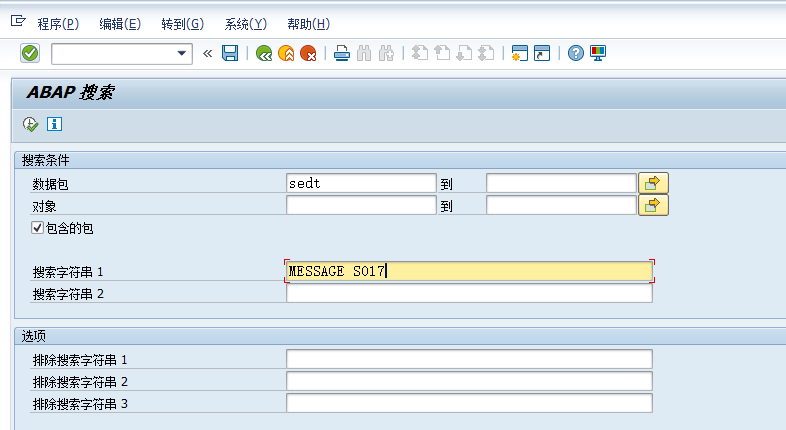方法4的理论依据是,既然我们在SE38里看到了DS017这条消息,那么SE38的实现代码里,必定会出现MESSAGE S017这行代码。因此在方法4里我们改变思路,不再采用动态调试的办法,而选择和它相反的思路。