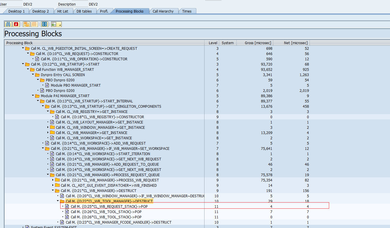 除此之外说句题外话,SAT的Processing Blocks界面以树形结构显示了ABAP代码的一层层调用关系,对于我们分析和学习复杂应用的执行逻辑也非常有帮助。