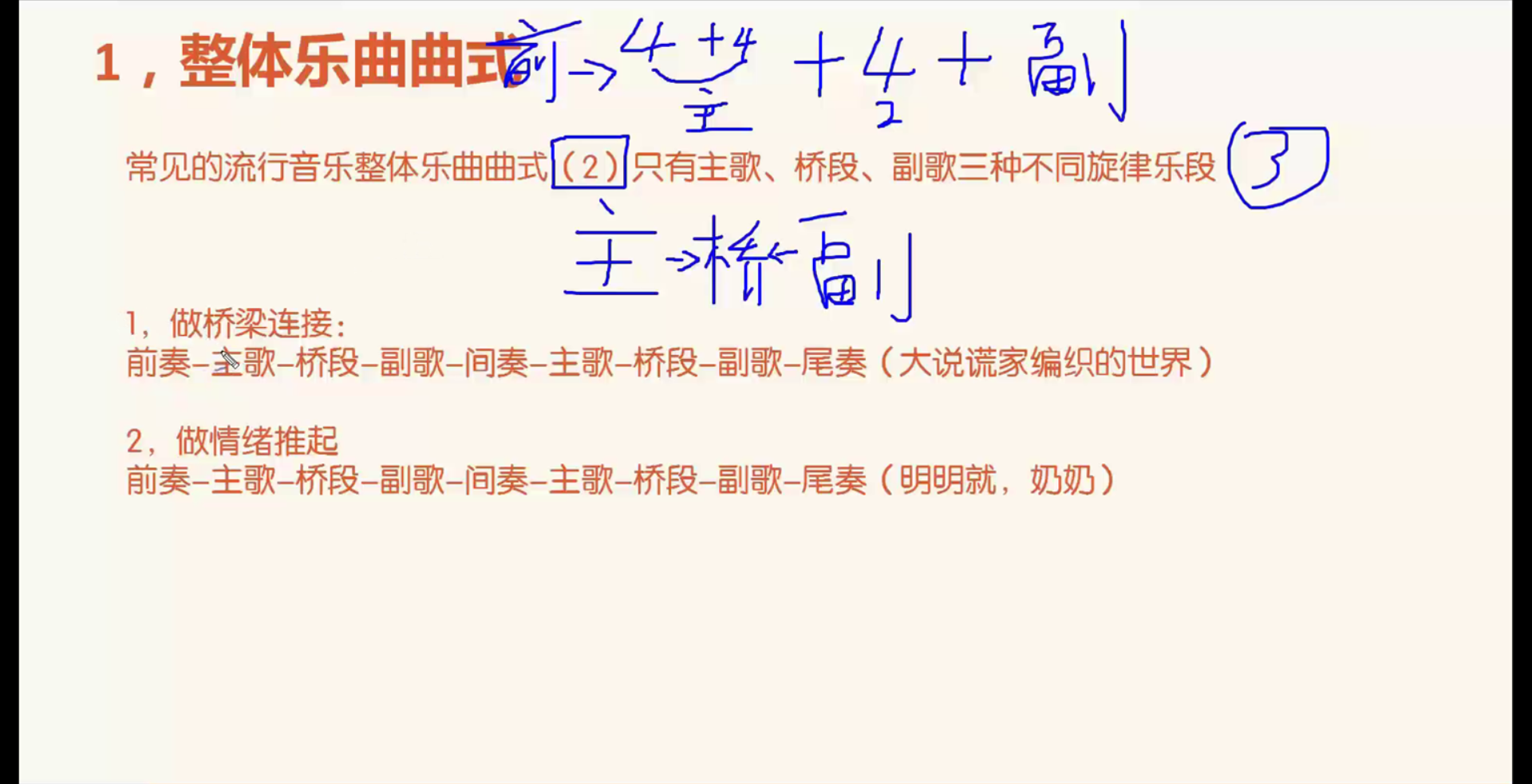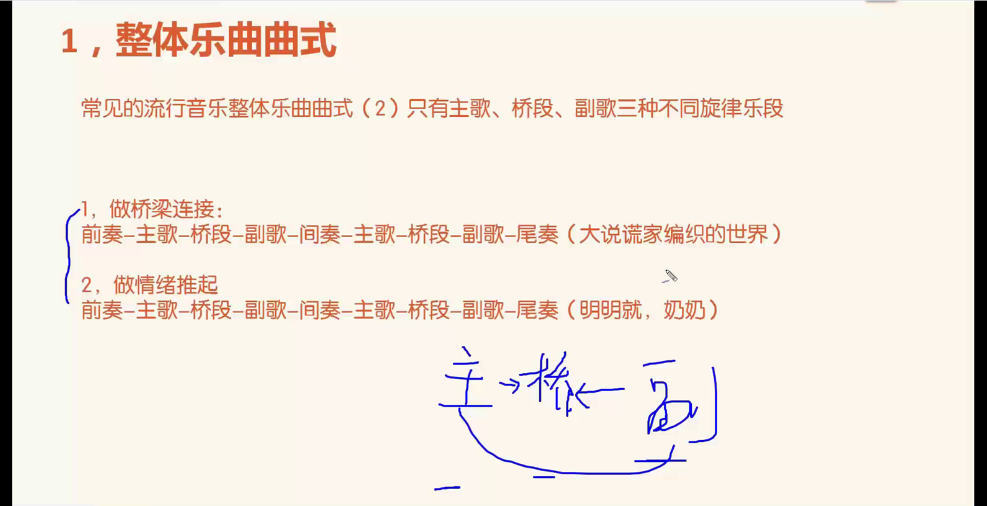 音域比较宽的歌曲会出现 做情绪推起的桥段。如,主歌和副歌之间音高差很大,直接过去就比较突兀,加个桥段一点儿一点儿将音高推上去。