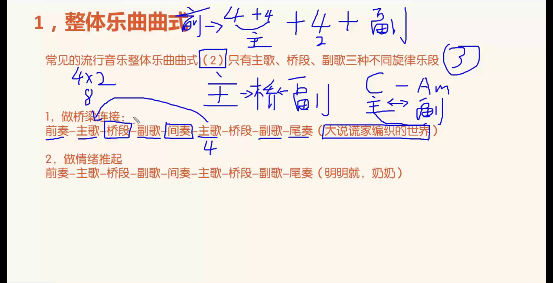 《大说谎家编制的世界》,主歌是C大调,副歌是Am大调,中间用桥段连接过渡一下会避免突兀。