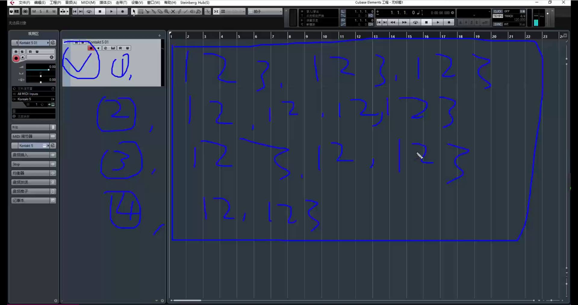 一个乐段有4句。每句的歌词用1、2、3等数字替代。每句结束都用3是为了押韵(an)。