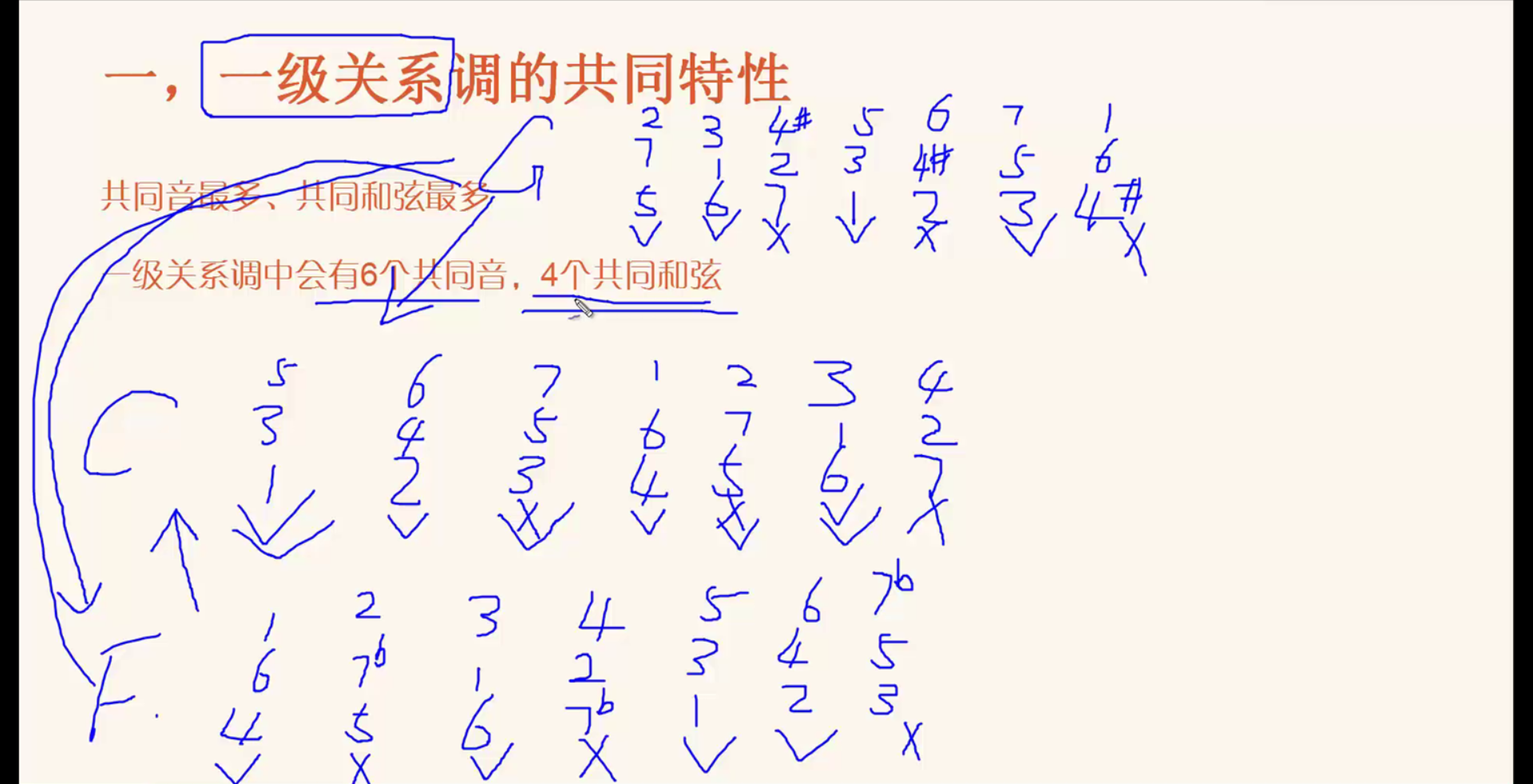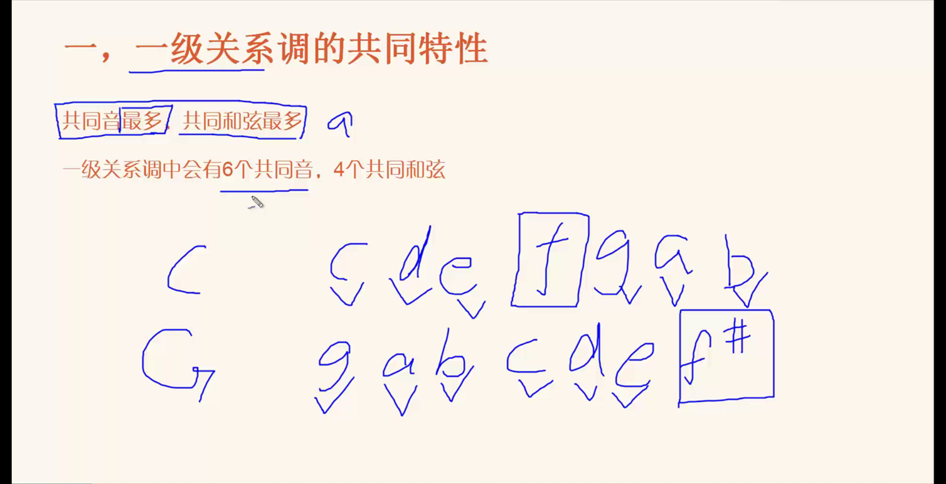 一级关系调中至少会有6个共同音,4个共同和弦。