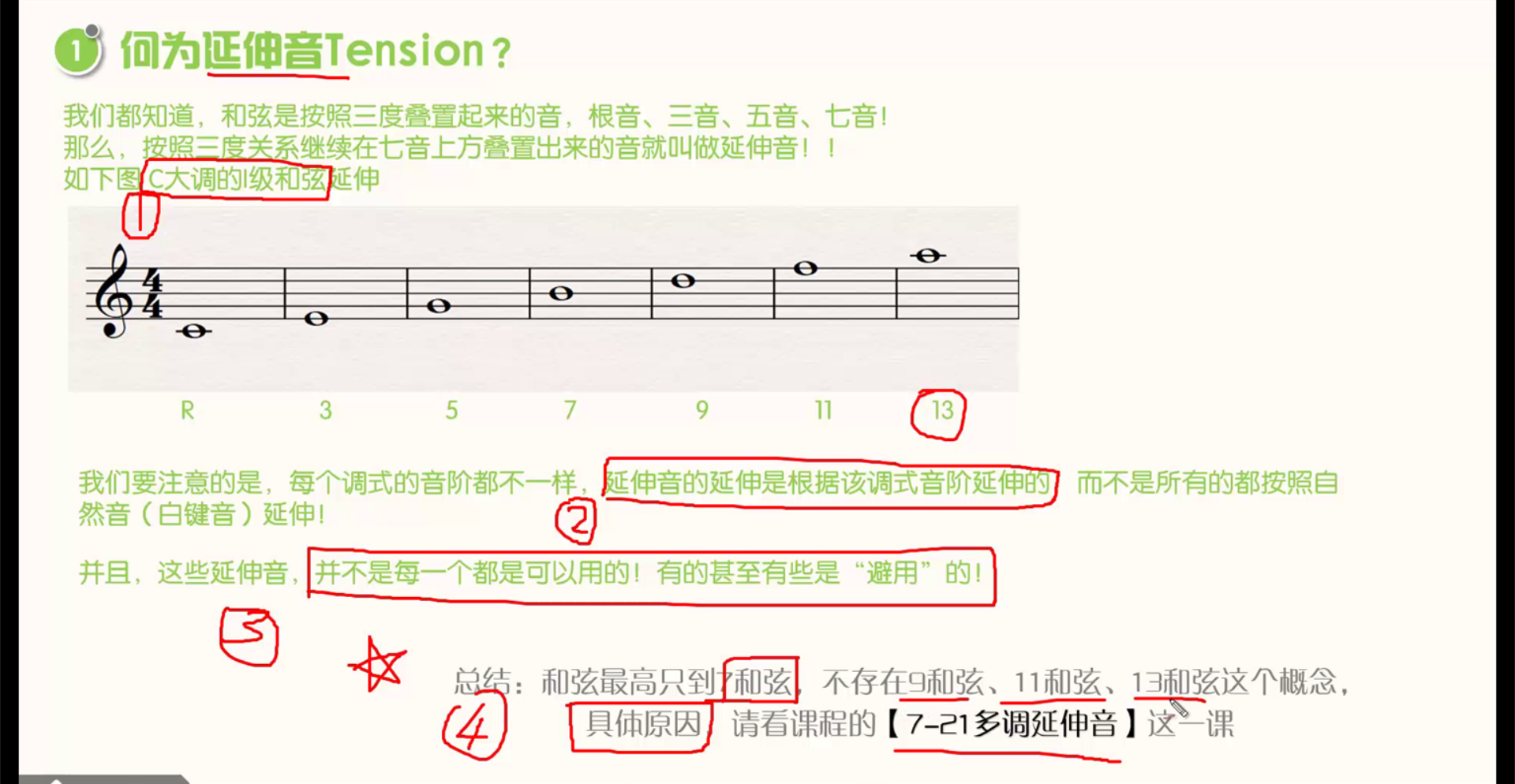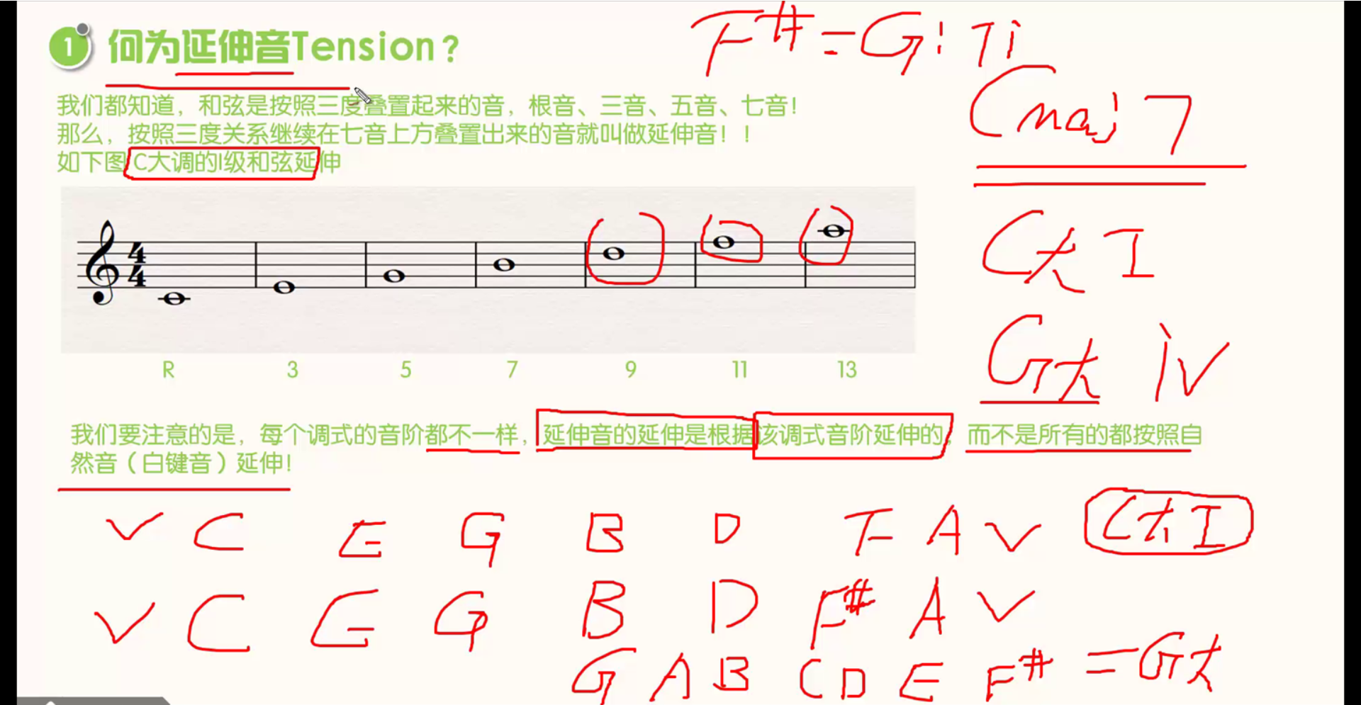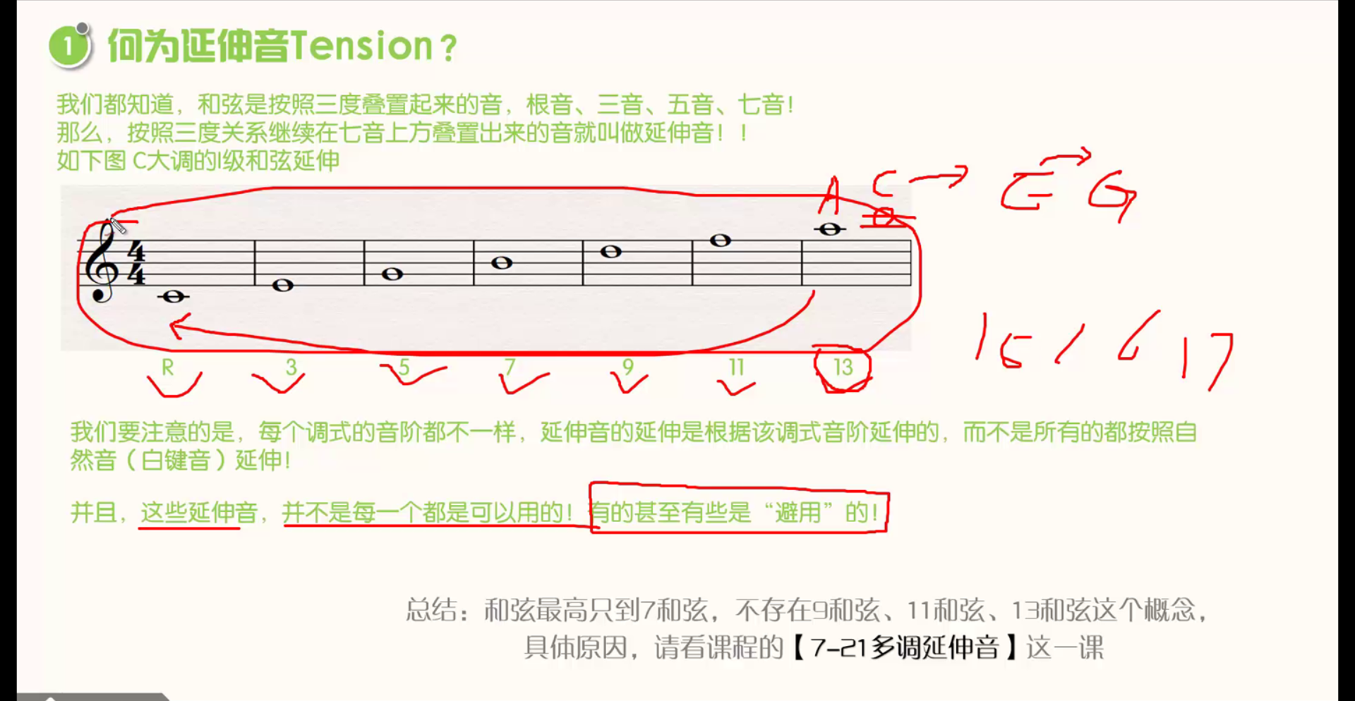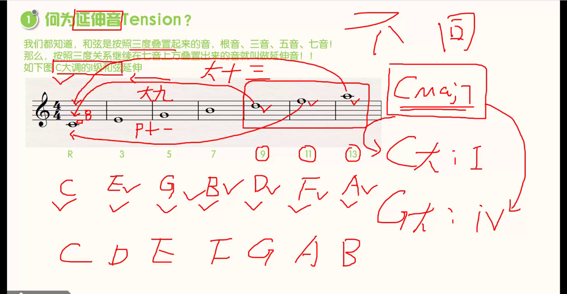确定是什么调式的几级和弦,才能确定延伸音。而不能仅说什么和弦的延伸音,上图展示了,同一个和弦在不同调式里的延伸音是不同的。
