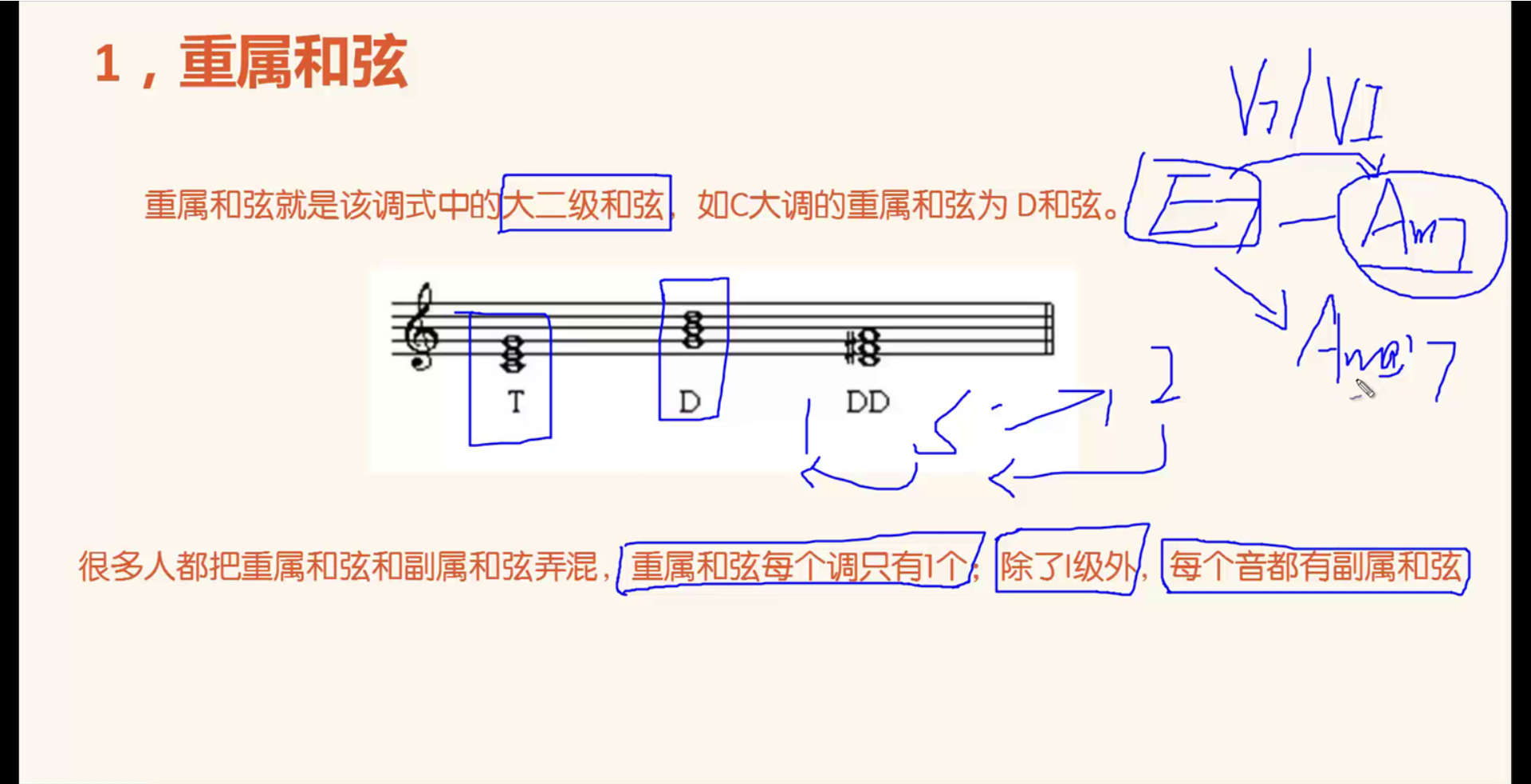 D7可以看成V7/V,G大调的属和弦,所以说成重(读chong,二声)属和弦(C大调的属的属和弦,V级的V级)。