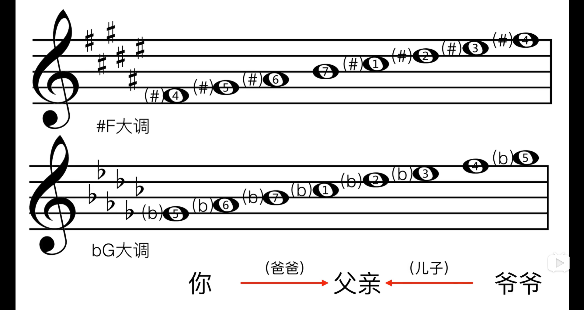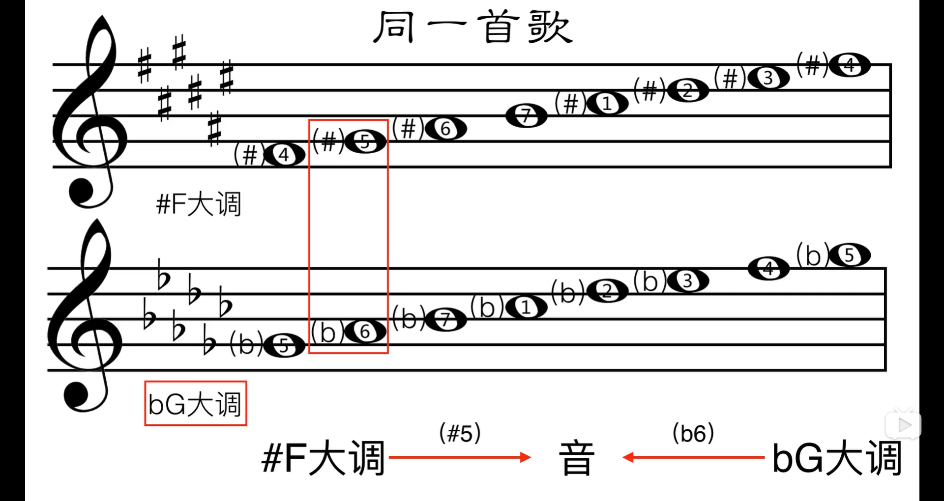 同一首歌如果既可以用#F大调也可以用bG大调记谱,一般人们用bG大调记谱。
