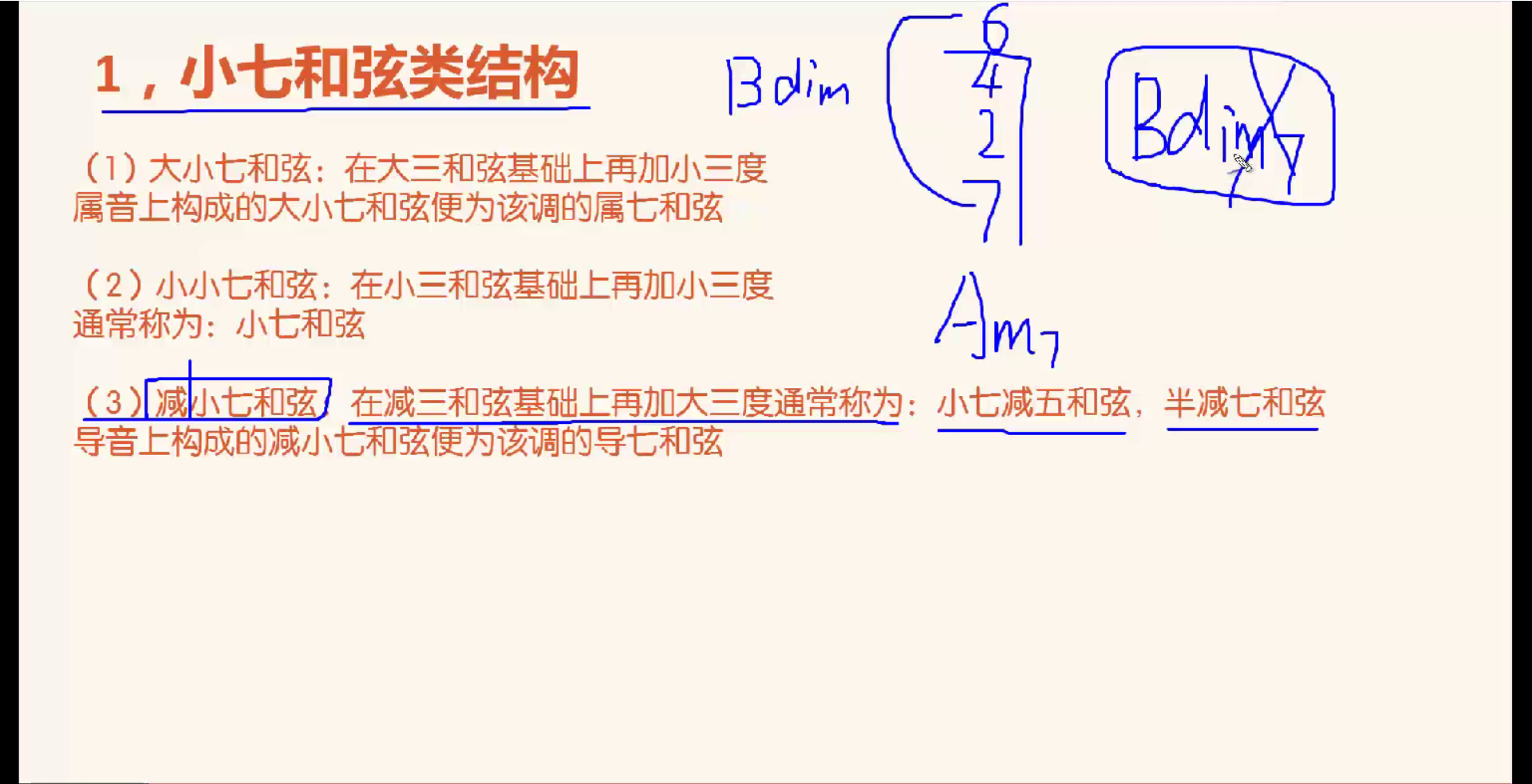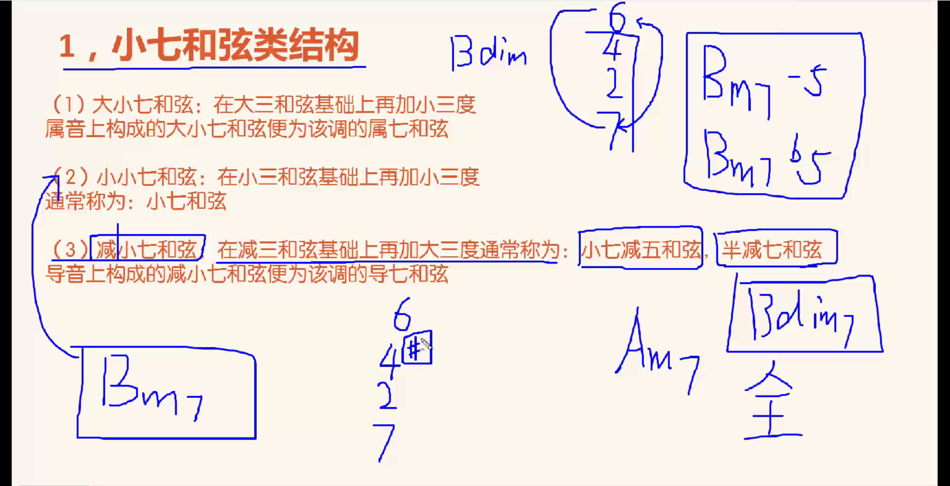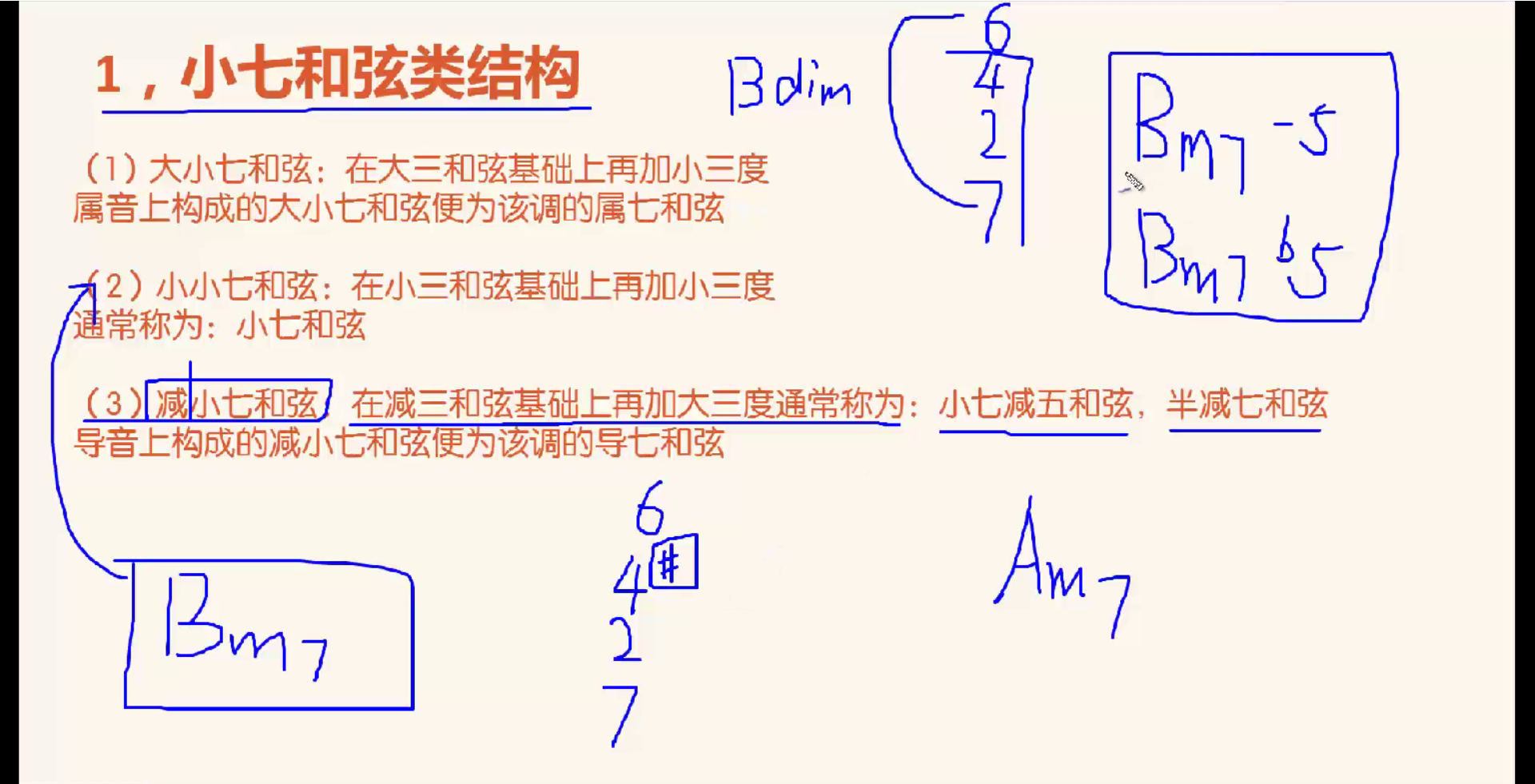 Bdim加大三和弦构成减小七和弦,写为Bm7-5或Bm7b5,而不可以写为Bdim7,Bdim7真的是减七和弦(见下节课)。