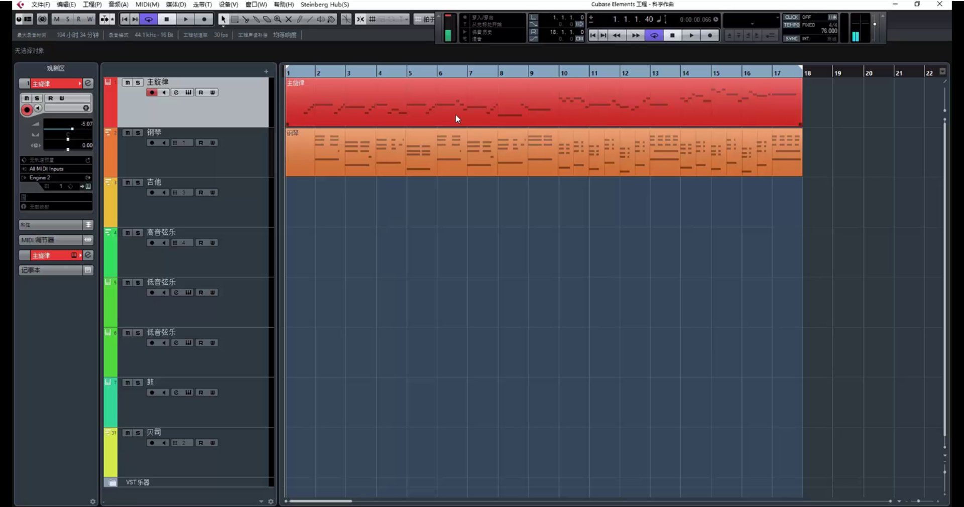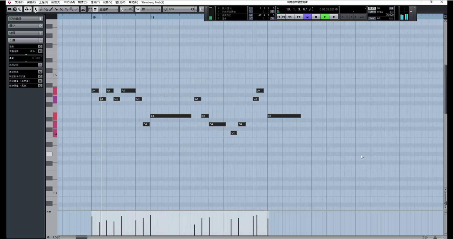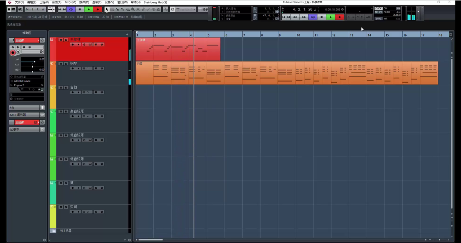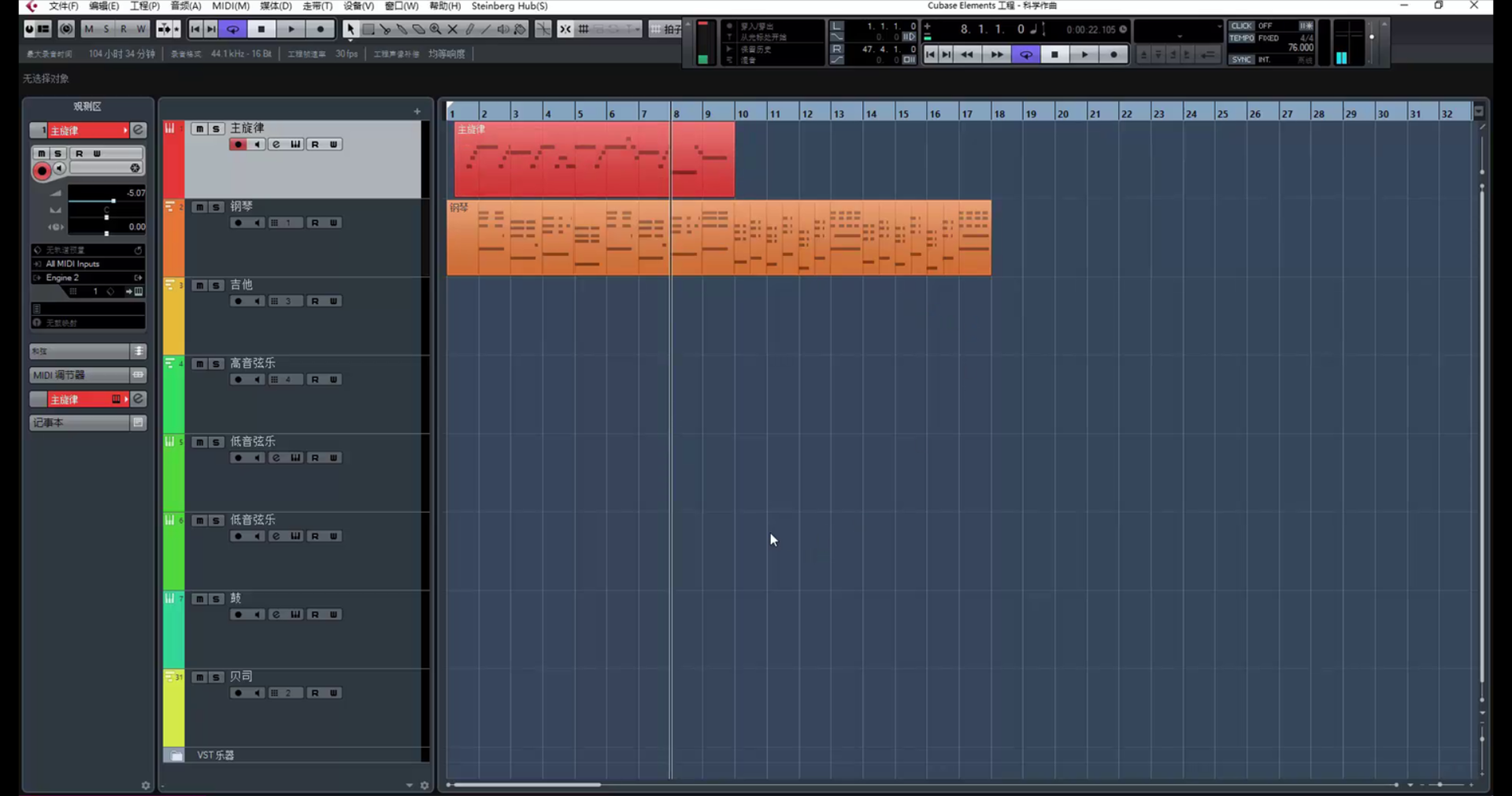 继续创作。(在这里遇到一个问题,乐器没音了,因为超出了乐器音域范围。解决方法是降八度。)