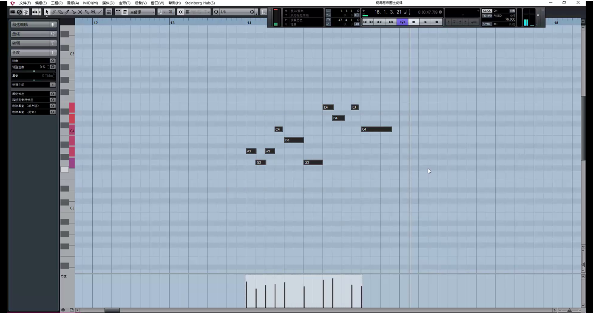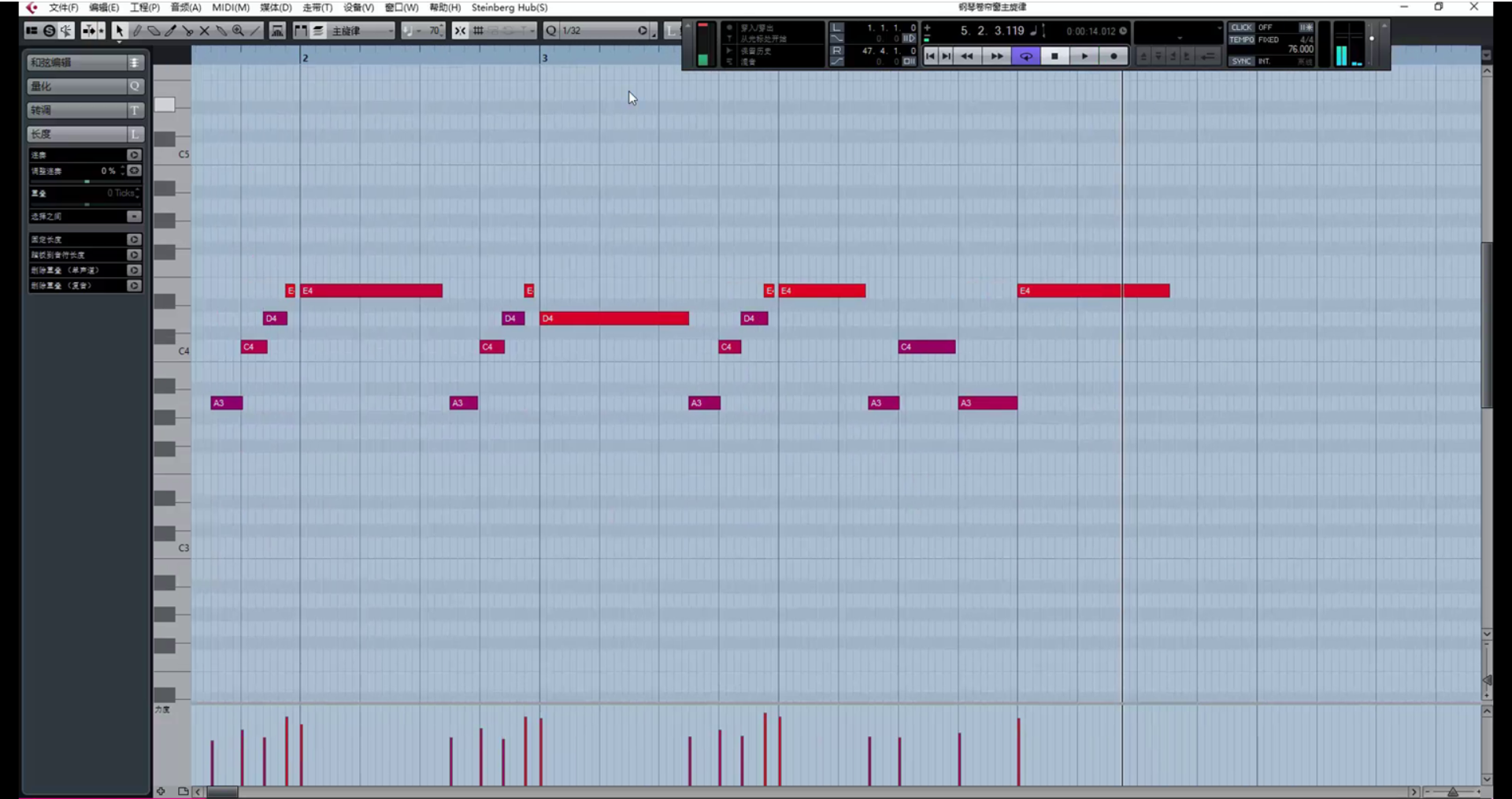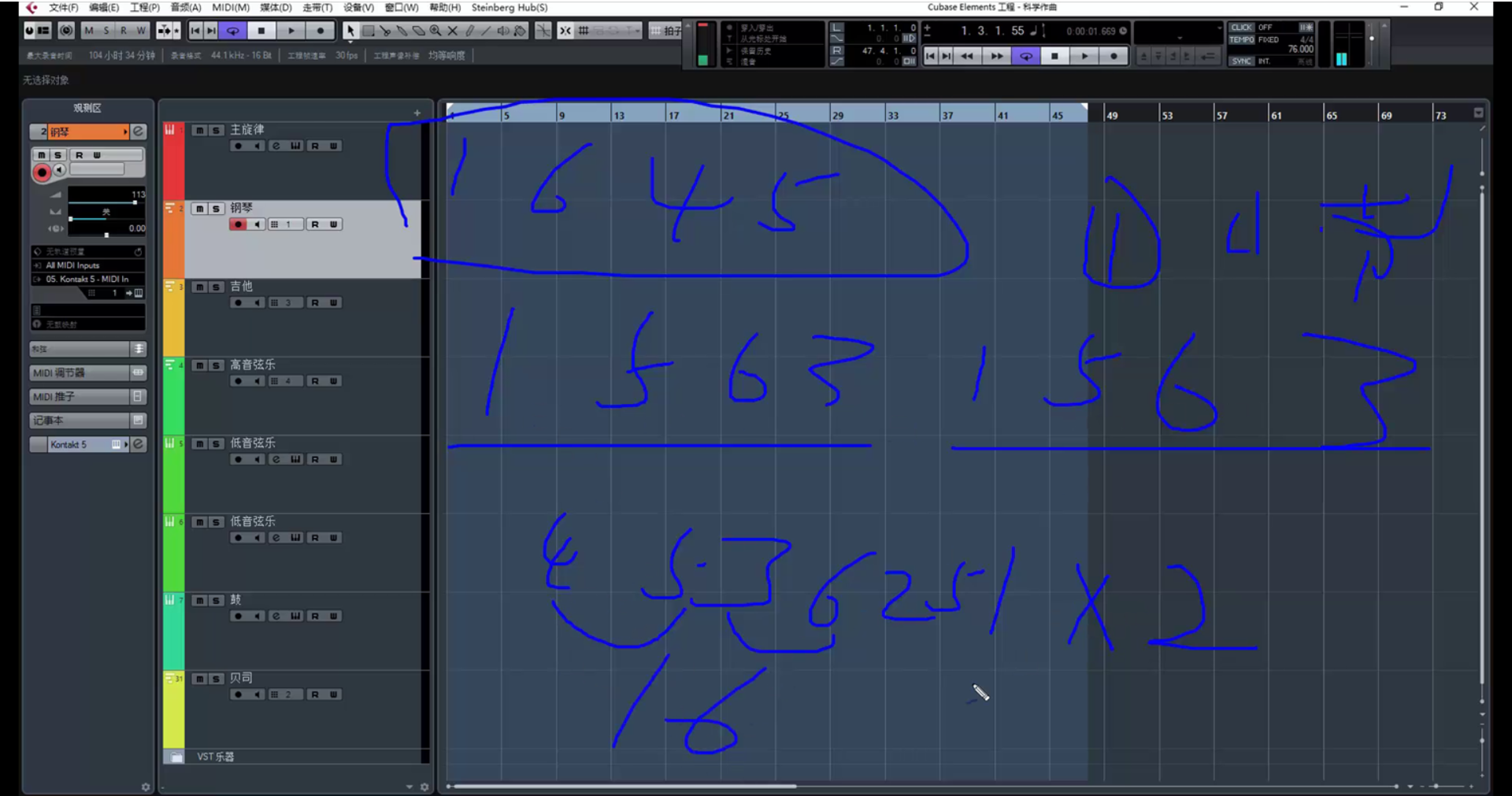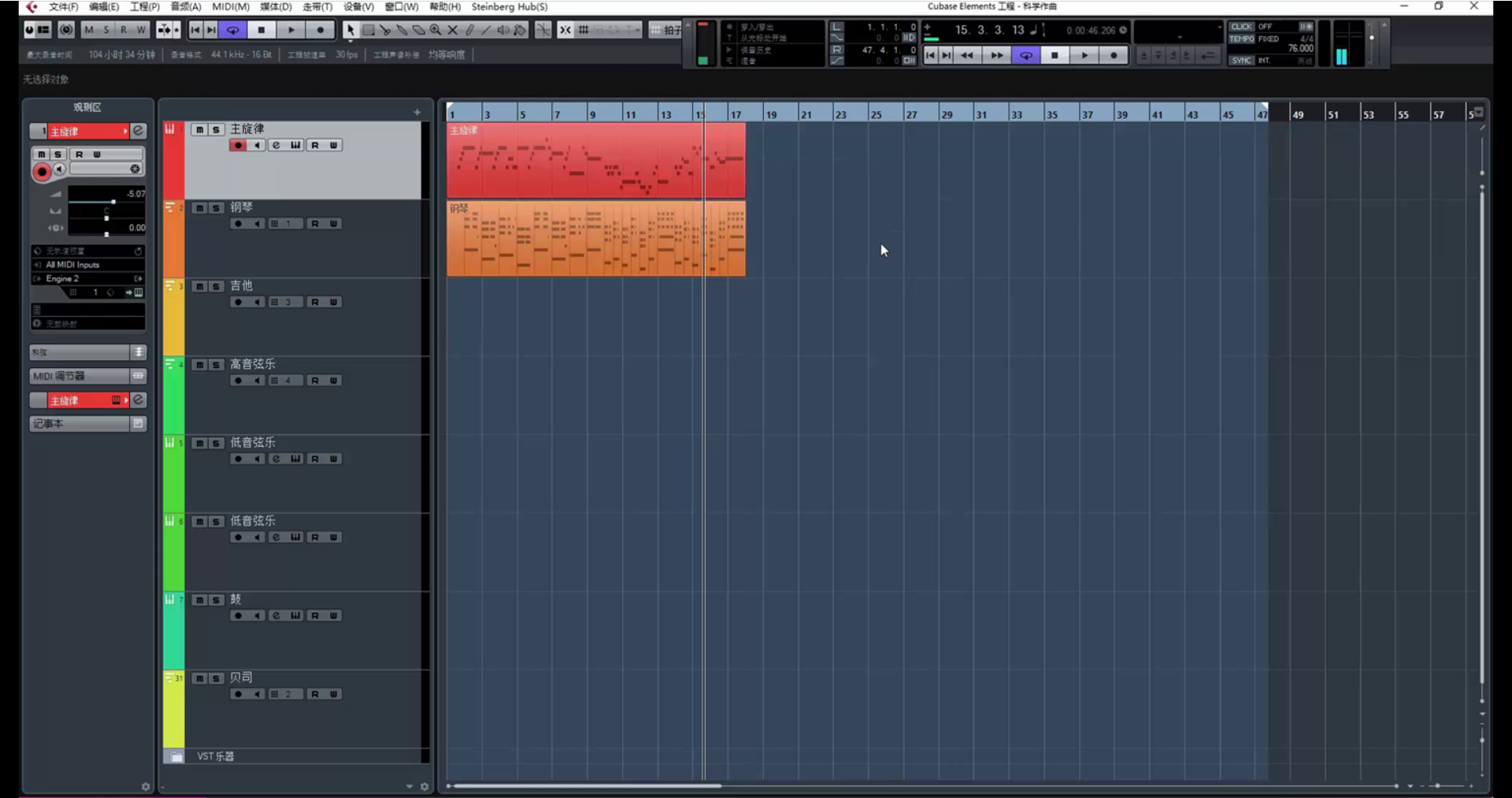 继续创作。(在这里遇到一个问题,乐器没音了,因为超出了乐器音域范围。解决方法是降八度。)