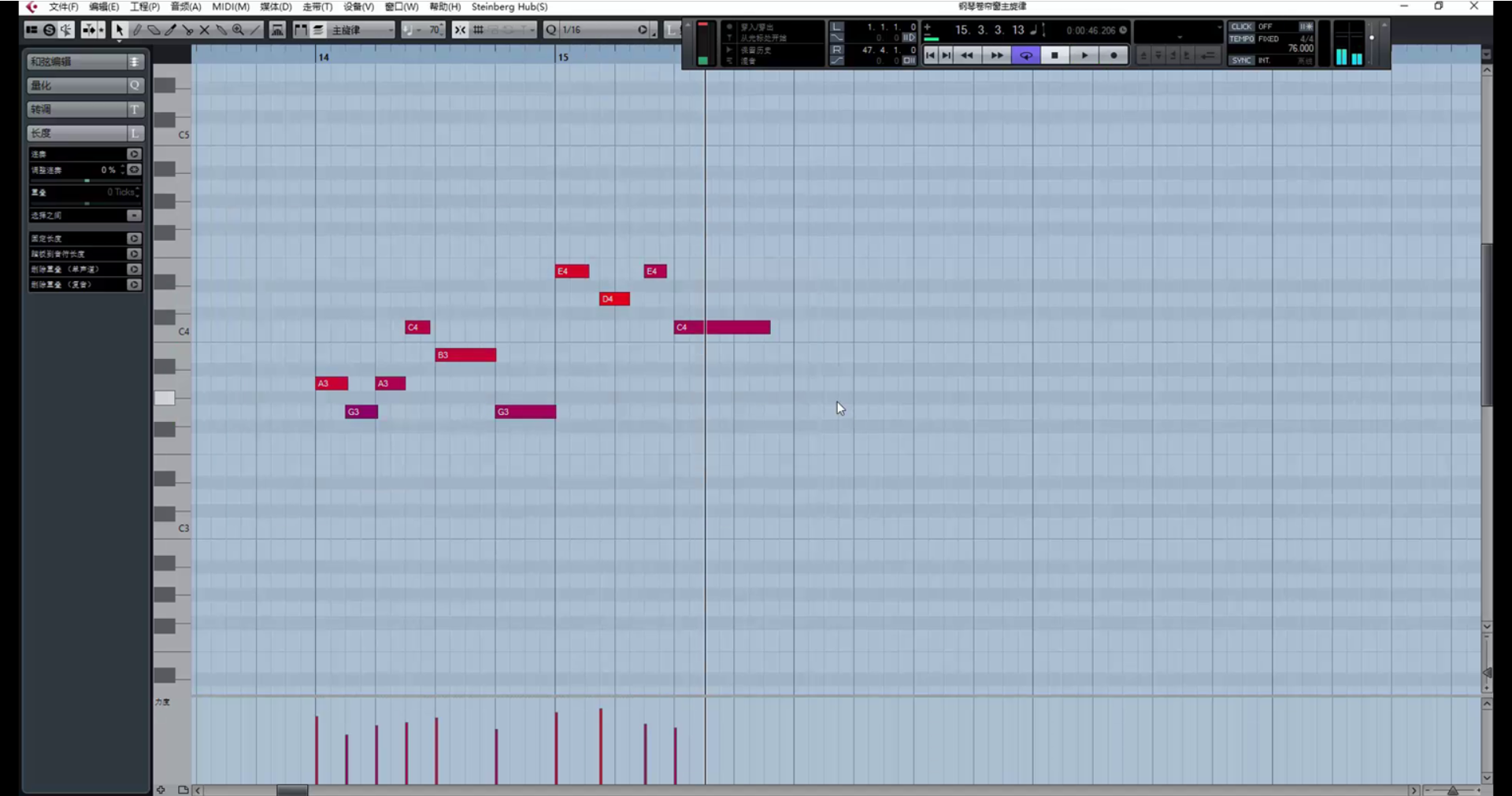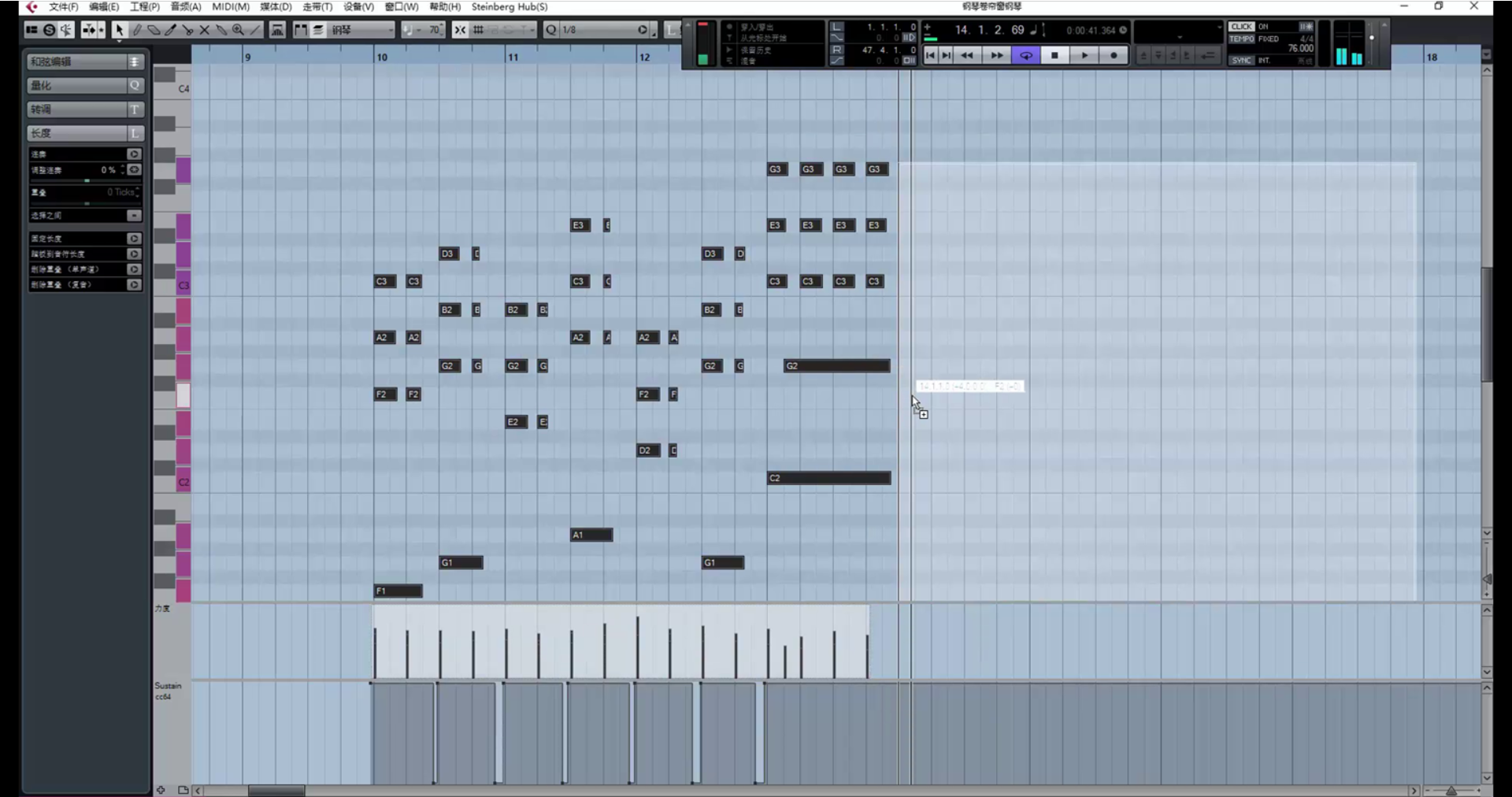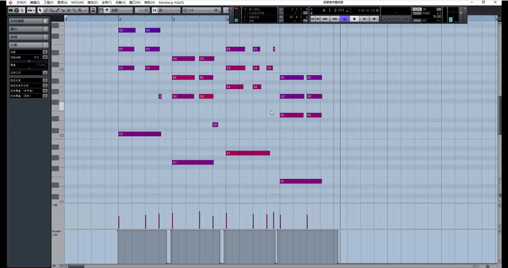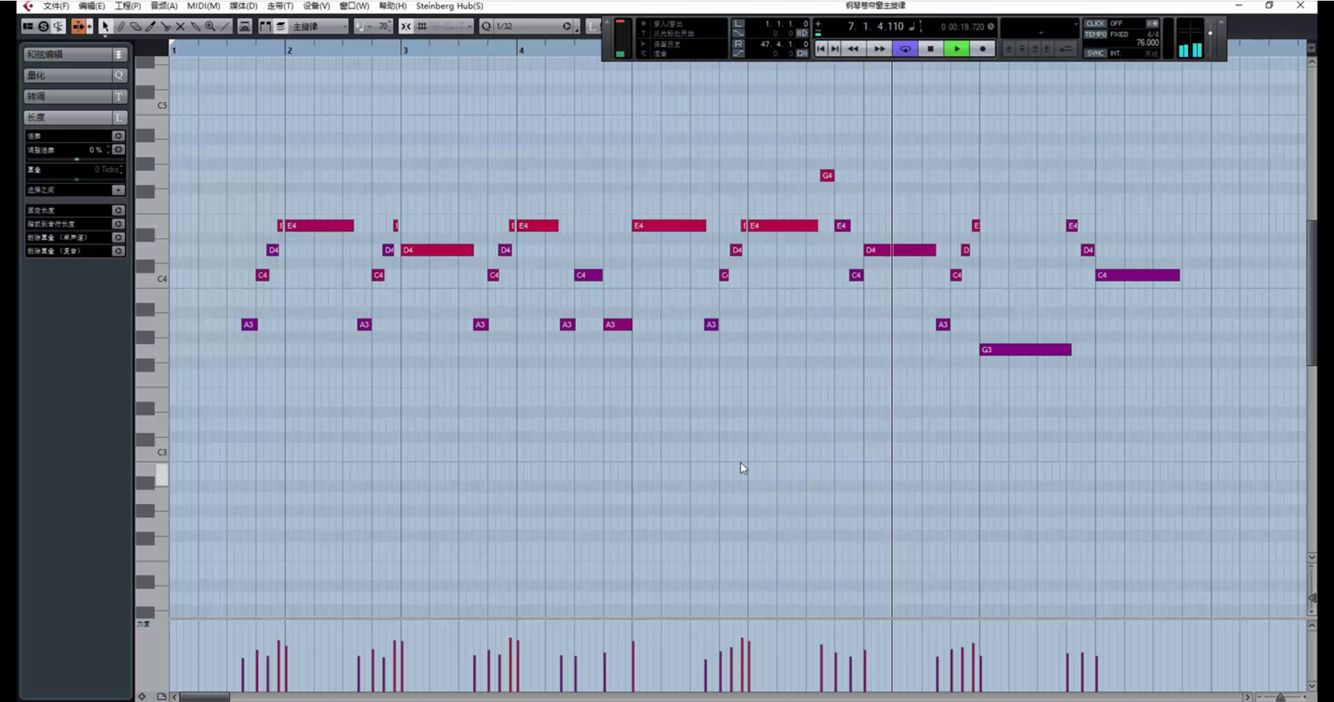 继续创作。(在这里遇到一个问题,乐器没音了,因为超出了乐器音域范围。解决方法是降八度。)