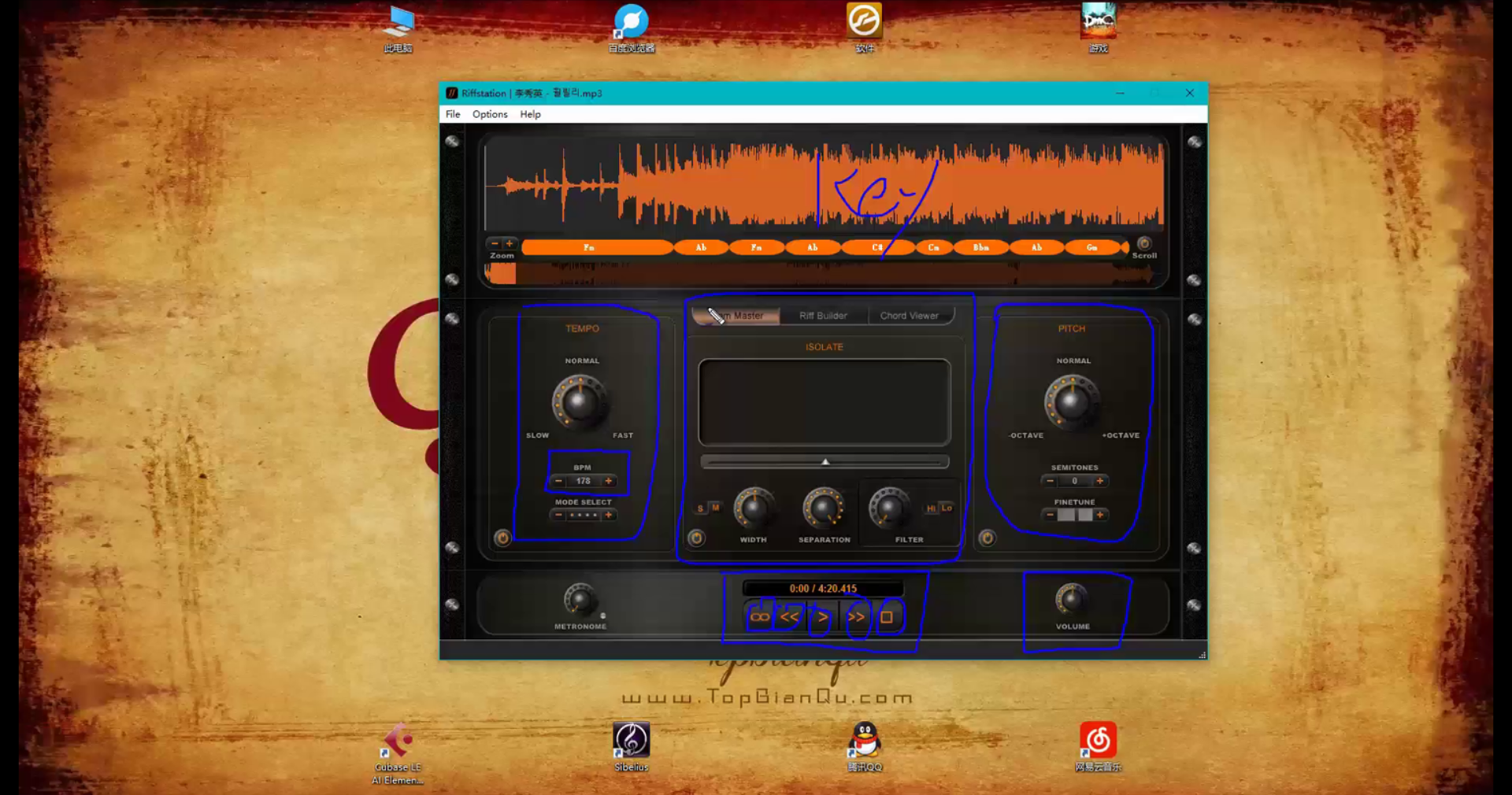 左上是音速调节区,右上是音高调节曲;左下是走带控制器,右下是音量控制器。中间的是控制左右声道的,可以做消音伴奏。不管怎么调,点击鼠标🖱右键就还原回去了。