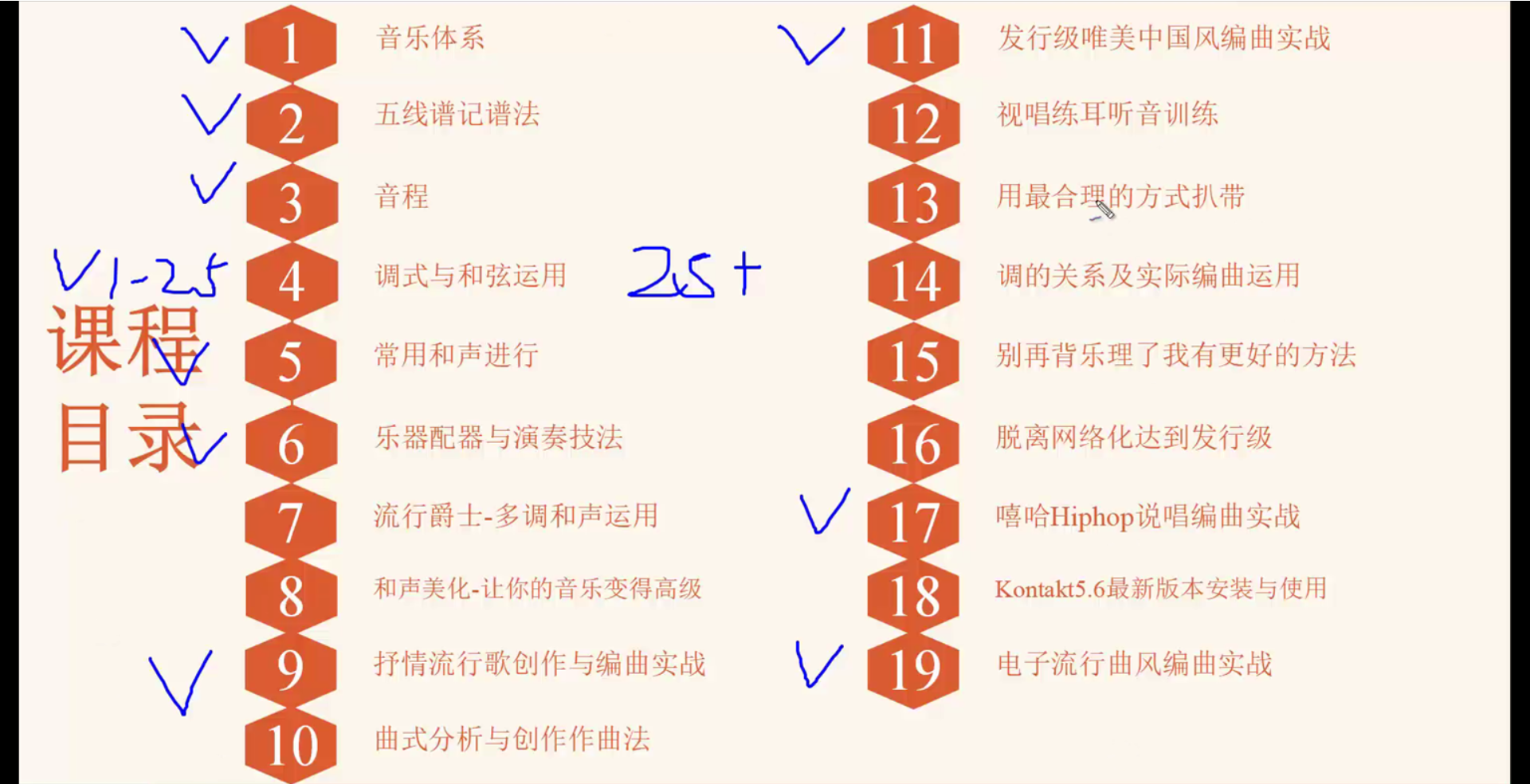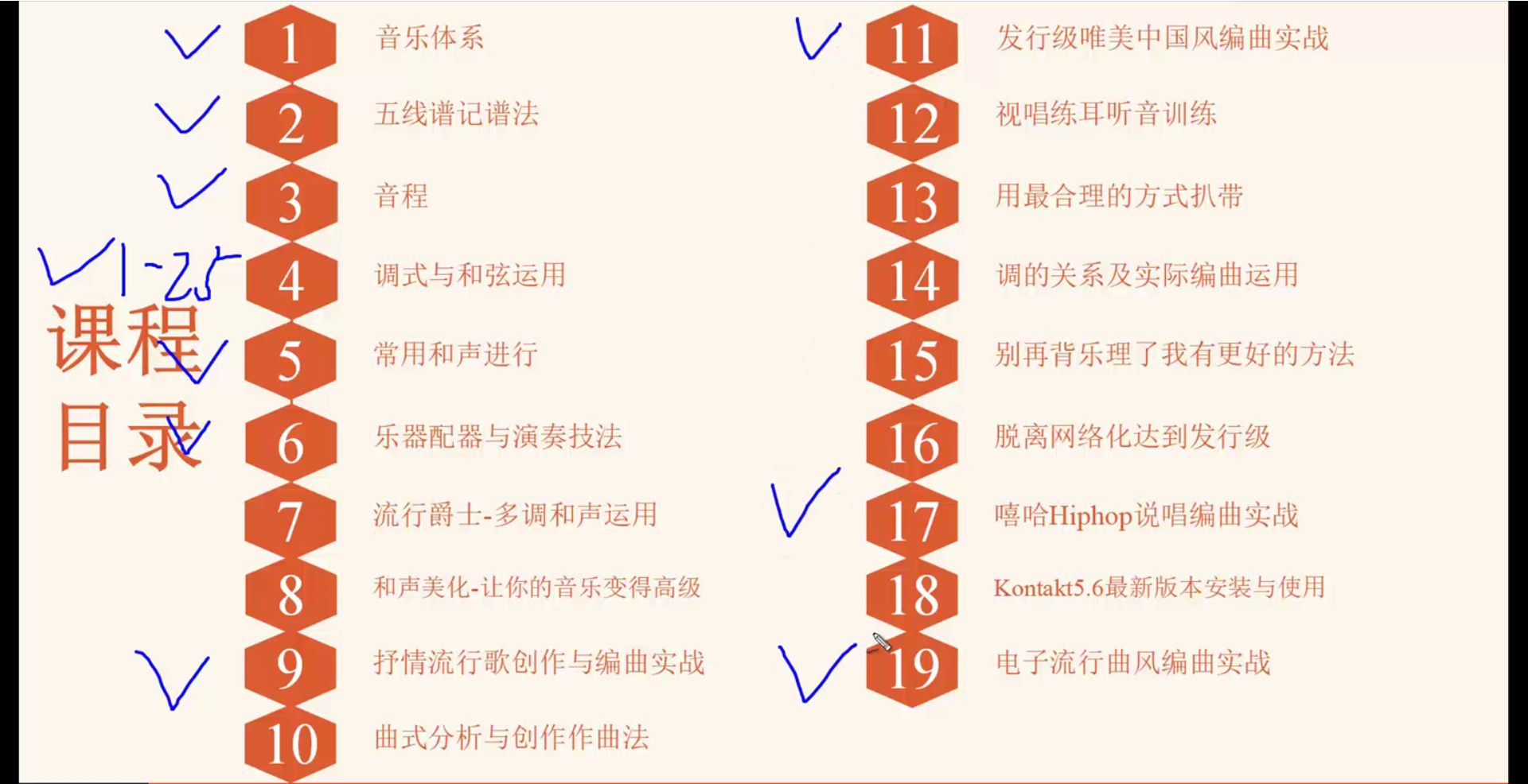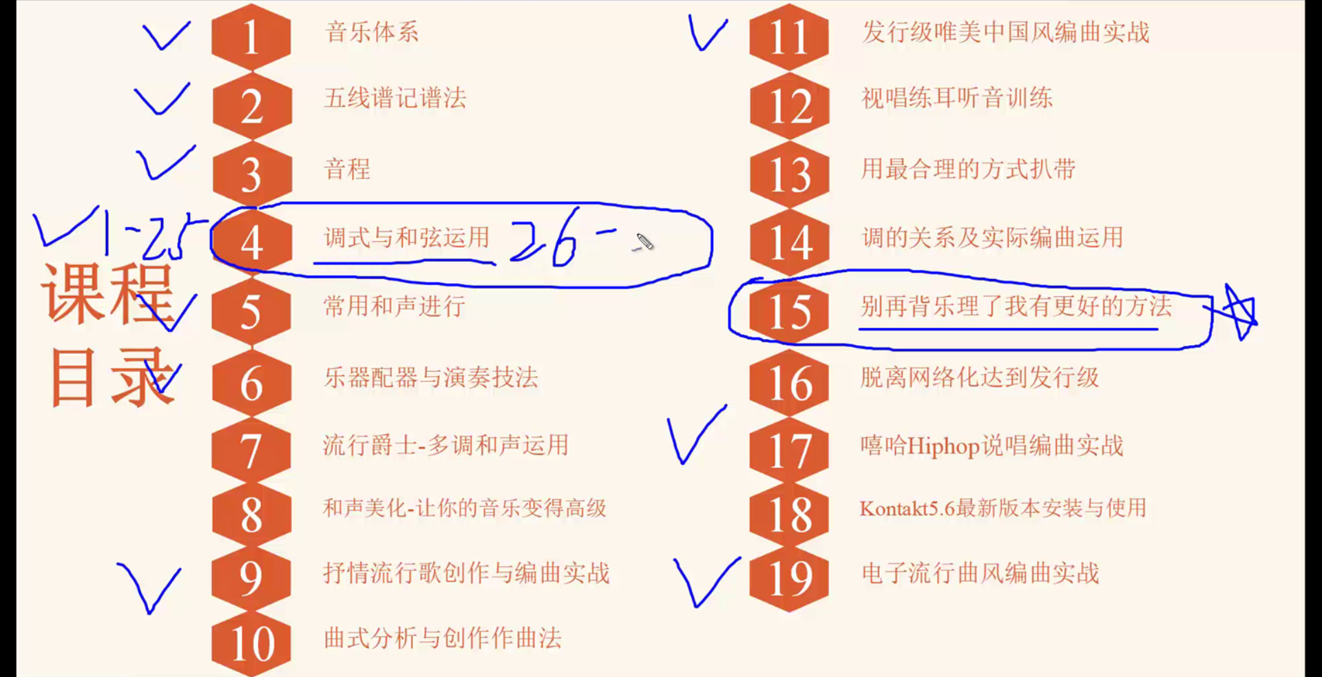 以最快速的时间学会编曲,作出自己的作品。那么学习顺序就是上面画对勾的。