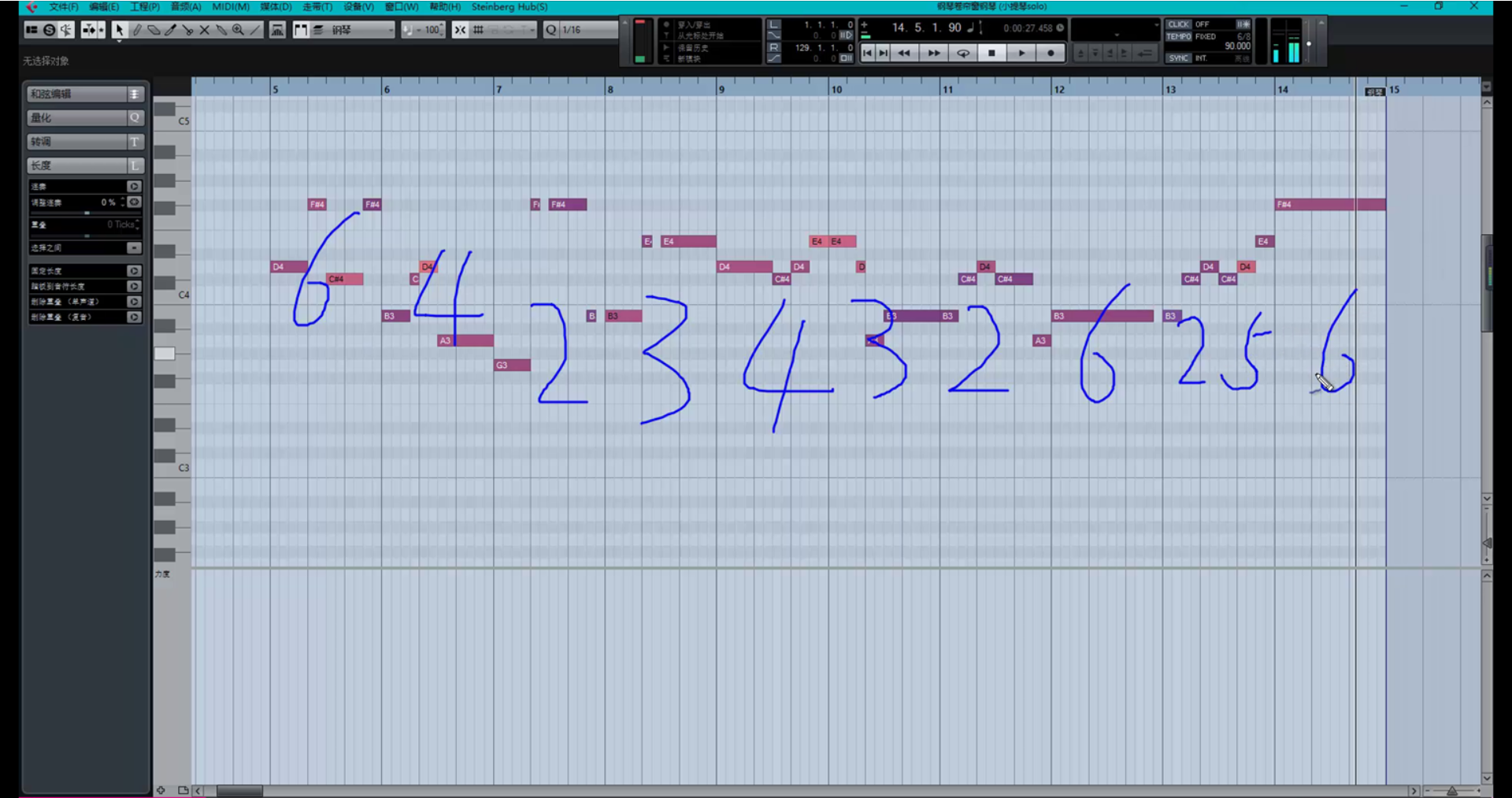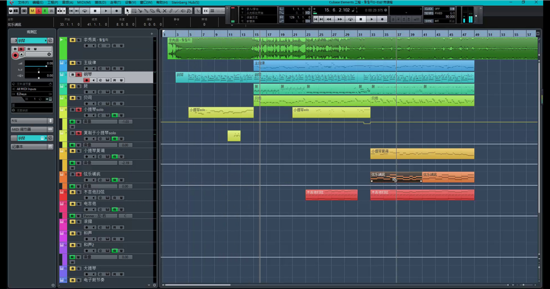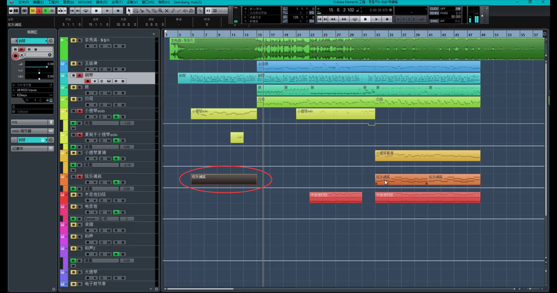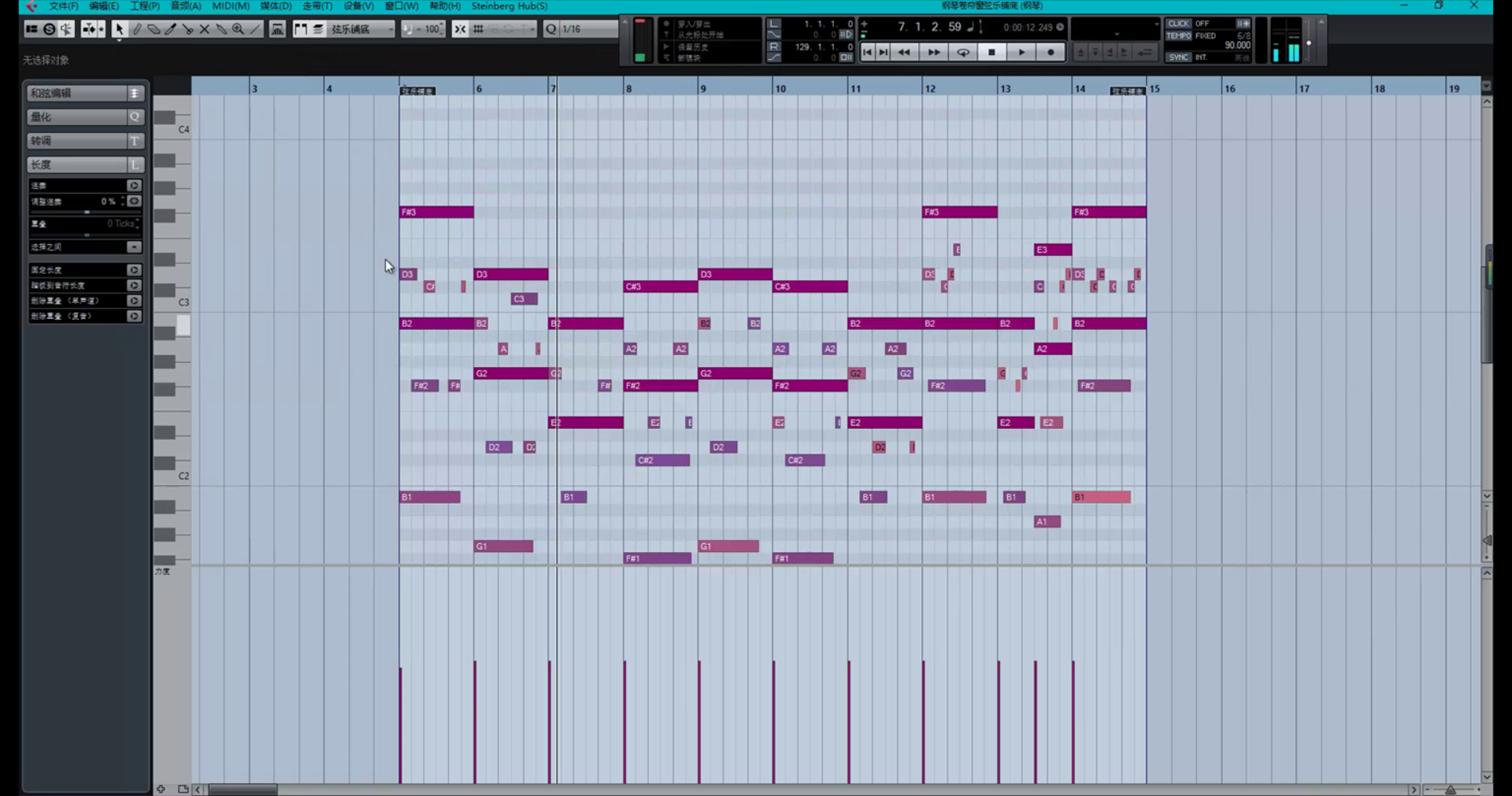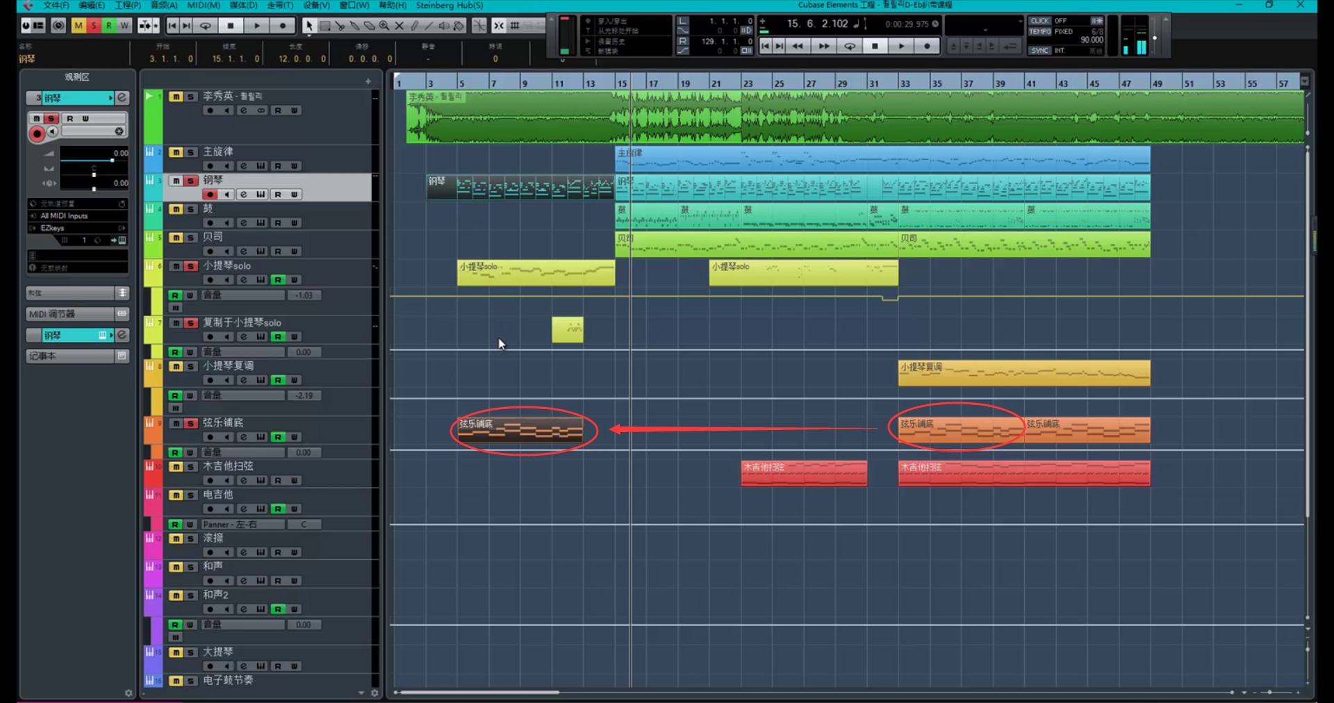 然后选中上面的前奏钢琴部分并与之比较进而修改复制过来的弦乐铺底的和声体系。