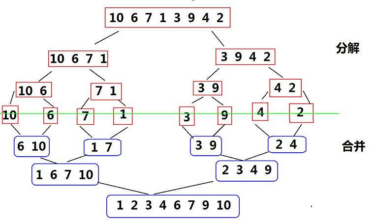 归并排序就是利用归并的 思想实现的排序方法。它的基本原理:对于给定的一组记录,利用递归与分治方法将数据序列划分成为越来越少的半子表,在半子表排序,最后再用递归方法将排好序的半子表合并成越来越大的有序序列。