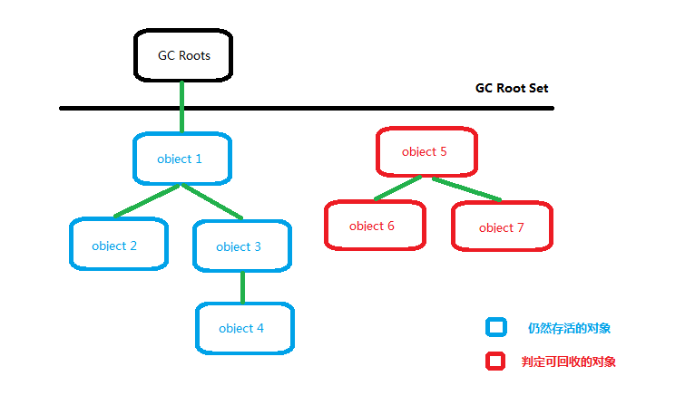 基本思想:通过一系列的成为“GC- Roots”的对象作为起始点,从这些节点开始向下搜索,搜索走过的路径称为引用链,当一个对象到GC Roots没有任何引用链相连时(用图论的话来说,就是从GC Roots到这个对象不可达),则证明此对象是不可用的。