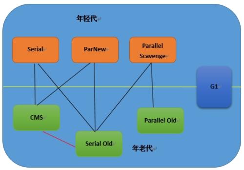 如果说收集算法是内存回收的方法论,那么垃圾收集器就是内存回收的具体实现。下图展示了7种作用于不同分代的收集器,如果两个收集器之间存在连线,就说明它们可以搭配使用。还有就是明确一个观点:虽然我们是在对各个收集器进行比较,但并非为了挑选出一个最好的收集器。因为直到现在为止还没有最好的收集器出现,更加没有万能的收集器,所以我们选择的只是对具体应用最合适的收集器。