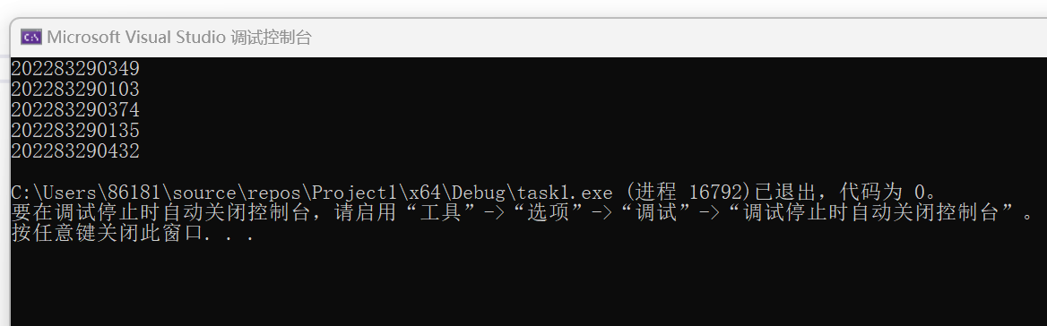 #include <stdio.h> #include <stdlib.h> #include <time.h> #define N 5 int main() { int number; int i; srand(time(0)); for (i = 0; i < N; ++i) { number = rand() % 500 + 1; printf("20228329%04d\n", number); } return 0; }