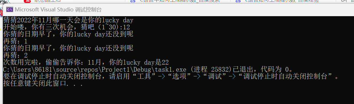 #include<stdio.h> #include<stdlib.h> #include<time.h> int main() { int n, i, m; srand(time(0)); i = rand() % 29 + 1; printf("猜猜2022年11月哪一天会是你的lucky day\n"); printf("开始喽,你有三次机会,猜吧(1~30):"); scanf_s("%d", &n); for (m = 1; m <3; m++) { if (n > i) { printf("你猜的日期晚了,你的lucky day已经过啦\n"); printf("再猜:"); scanf_s("%d", &n); } else if (n < i) { printf("你猜的日期早了,你的lucky day还没到呢\n"); printf("再猜:"); scanf_s("%d", &n); } else { printf("哇,猜中了:-)"); break; } } if (m == 3) { printf("次数用完啦,偷偷告诉你:11月,你的lucky day是%d", i); } return 0; }
