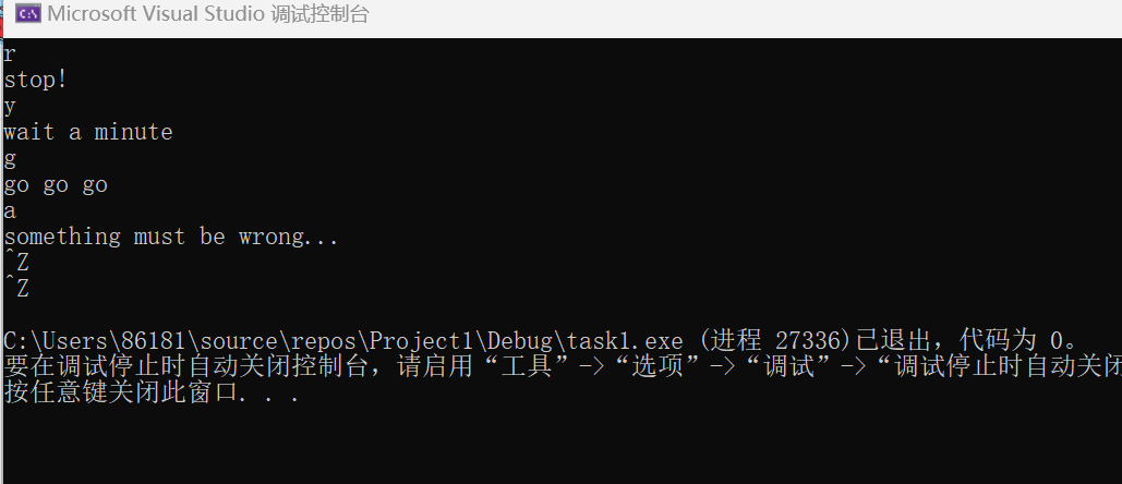 #include<stdio.h> #include<stdlib.h> int main() { char n; while(scanf_s("%c",&n)!=EOF) { switch (n) { case 'y': printf("wait a minute\n"); break; case 'g': printf("go go go\n"); break; case'r': printf("stop!\n"); break; default: printf("something must be wrong...\n"); break; } getchar(); } return 0; }
