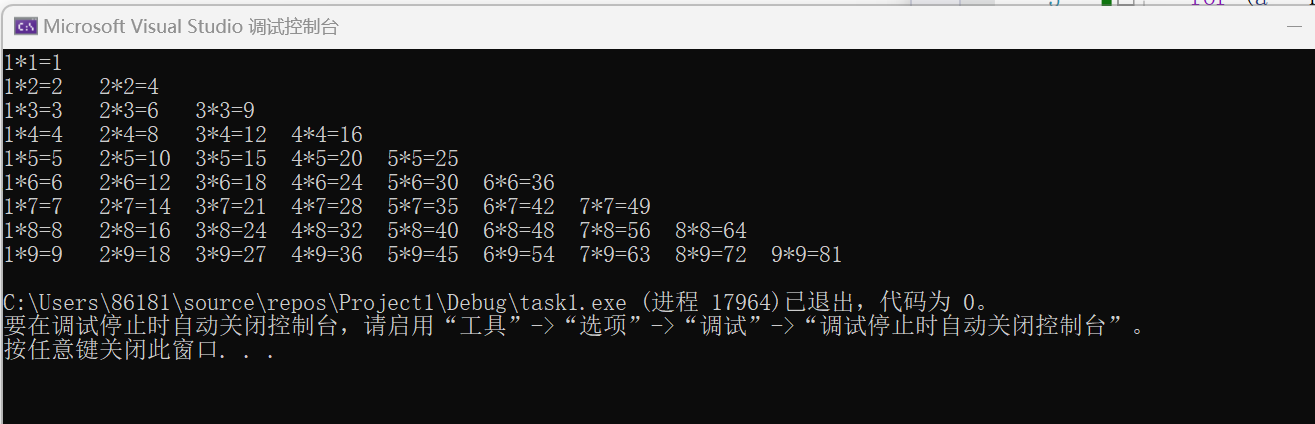 #define _CRT_SECURE_NO_WARNINGS #include<stdio.h> #include<stdlib.h> int main() { int a, b, c; for (a = 1; a < 10; a++) { for (b = 1; b <= a; b++) { c = a * b; printf("%dx%d=%d\t", a, b, c); } printf("\n"); } system("pause"); return 0;