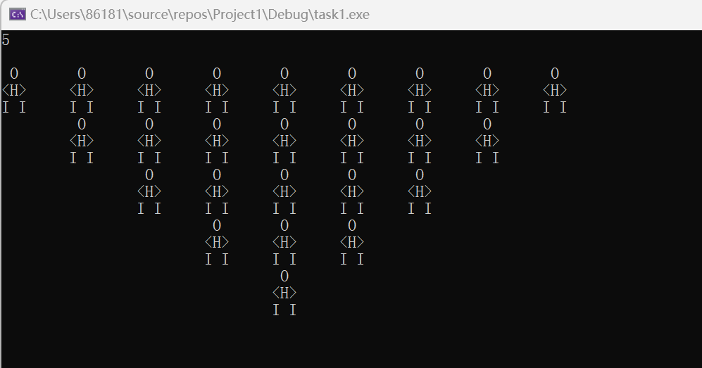 #include<stdio.h> #include<math.h> int main() { int i, j, m, t, n; for (;;) { scanf_s("%d", &n); printf("\n"); t = 1; for (j = 1; j <= n; --n) { for (m= 1; m < t; ++m) { printf("\t"); } for (i = 1; i <= 2 * n - 1; ++i) { printf(" O \t"); } printf("\n"); for (m = 1; m < t; ++m) { printf("\t"); } for (i = 1; i <= 2 * n - 1; ++i) { printf("<H>\t"); } printf("\n"); for (m = 1; m < t; ++m) { printf("\t"); } for (i = 1; i <= 2 * n - 1; ++i) { printf("I I\t"); } printf("\n"); ++t; } } return 0; }