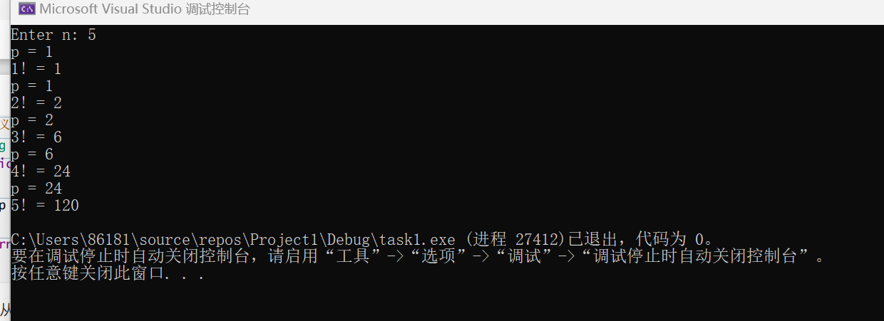 #include <stdio.h> long long fac(int n); int main() { int i, n; printf("Enter n: "); scanf_s("%d", &n); for (i = 1; i <= n; ++i) printf("%d! = %lld\n", i, fac(i)); return 0; } long long fac(int n) { static long long p = 1; p = p * n; return p; }